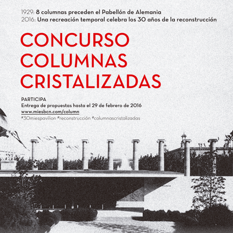 La Fundació Mies van der Rohe ha convocado el concurso Columnas Cristalizadas, un evento que nace con el objetivo de acercar la obra del reconocido arquitecto alemán a toda la ciudadanía y reflexionar sobre el impacto que tuvieron las columnas jónicas de Puig i Cadafalch en la obra del arquitecto alemán. Para participar, de deberá presentar la propuesta antes del 29 de febrero de 2016. Un Jurado estudiará las propuestas y valorará la coherencia con los objetivos del concurso; la calidad de la solución del diseño; la originalidad y la posibilidad técnica de construirlas; y escogerá un ganador que se dará a conocer el 10 de marzo. El 1 de junio de 2016, coincidiendo con los 30 años de la reconstrucción del Pabellón, se presentará la recreación en un acto público. El plazo máximo de presencia física de las columnas recreadas se prevé de 5 meses.