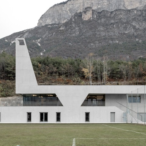 En muchos sentidos, Fieldhouse es una pieza conectora, parte del rompecabezas más grande de los asentamientos de pueblos pequeños que bordean las cuencas de los valles del Tirol del Sur: barrios residenciales, zonas de industria ligera e infraestructuras deportivas se sientan uno al lado del otro en franjas limitadas de tierra. Situada en el punto de inflexión entre el valle y la montaña, Fieldhouse se caracteriza por una planta regular y alargada, al mismo tiempo que proporciona un perfil geométrico audaz en elevación que se mide contra el paisaje vertical. En sección, Fieldhouse media la topografía con dos niveles que conectan los diversos programas y puntos de vista.