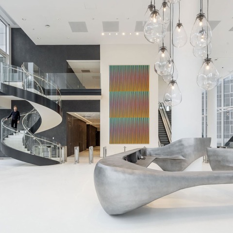 Se prestó especial atención al diseño de los muebles, creados por el arquitecto y fabricados por un constructor de cascos de barcos francés. Tres muebles de aluminio esculpidos y curvos de 43 metros de largo, hechos a medida, estructuran el vestíbulo, proporcionando áreas de descanso, mostradores de recepción, un escritorio de bar y más.