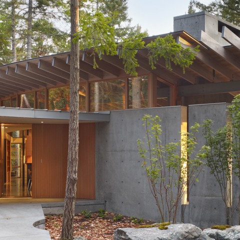 Esta residencia de retiro de 3,000 pies cuadrados está ubicada en un sitio de 26 acres compuesto por un bosque maduro de abetos Douglas y madroños del Pacífico, con claros ocasionales rocosos y varios estanques pequeños. Los clientes buscaron una casa que minimizara los impactos del sitio, que utilizara sus materiales favoritos (madera y concreto) y que los conectara íntimamente con la tierra y la vista.