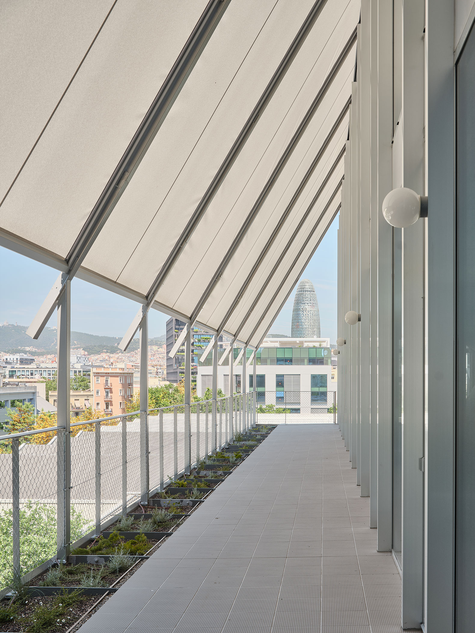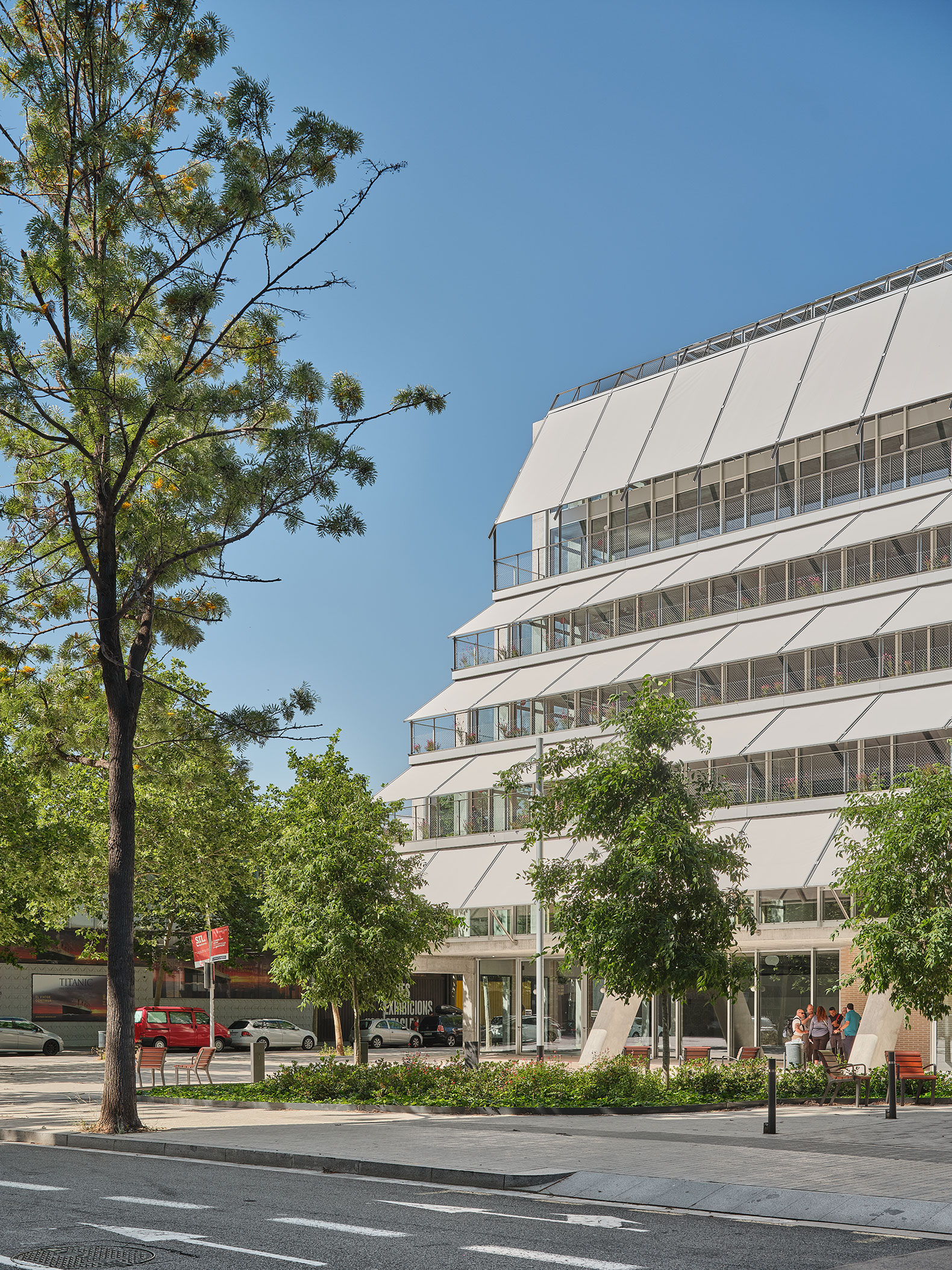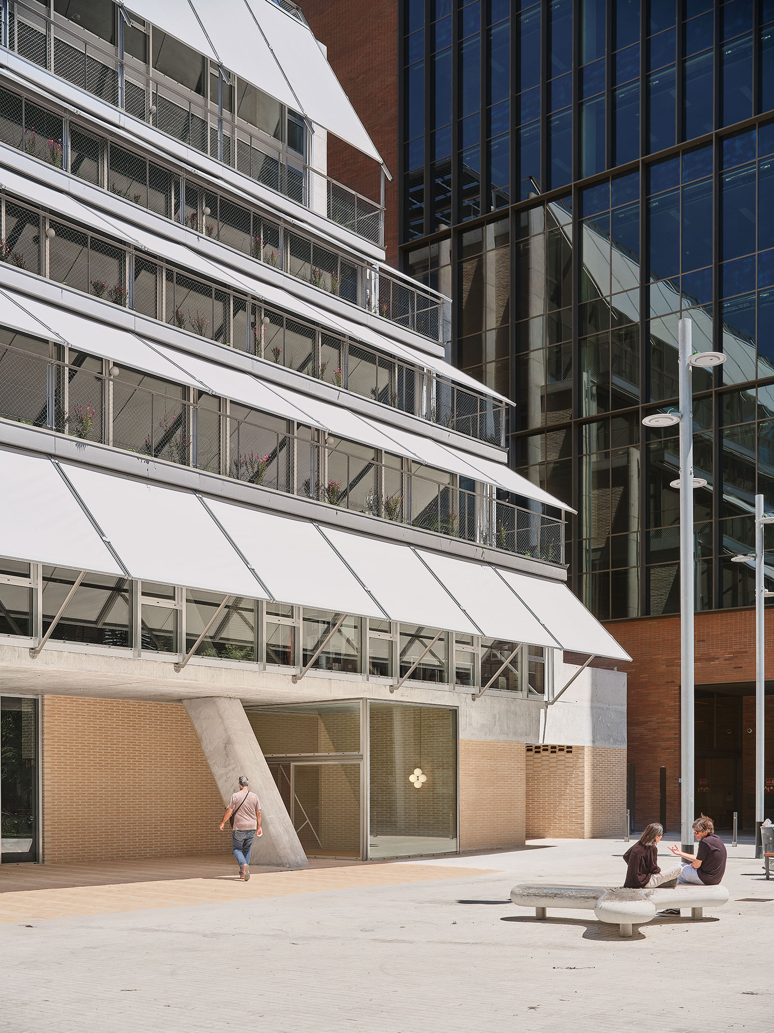 Las fachadas laterales se construyen a partir de un ritmo de pilares que sobresalen y protegen las ventanas del impacto directo del sol, y las terrazas se cubren mediante toldos tradicionales que se gestionan de manera automática en función de las condiciones solares.