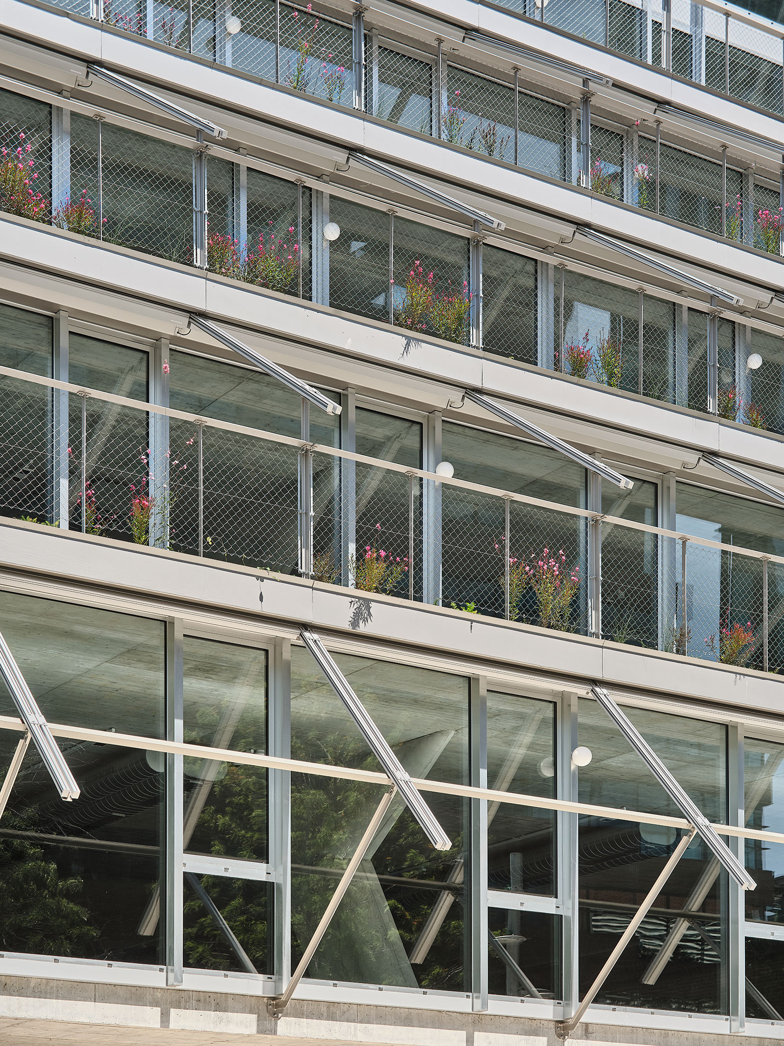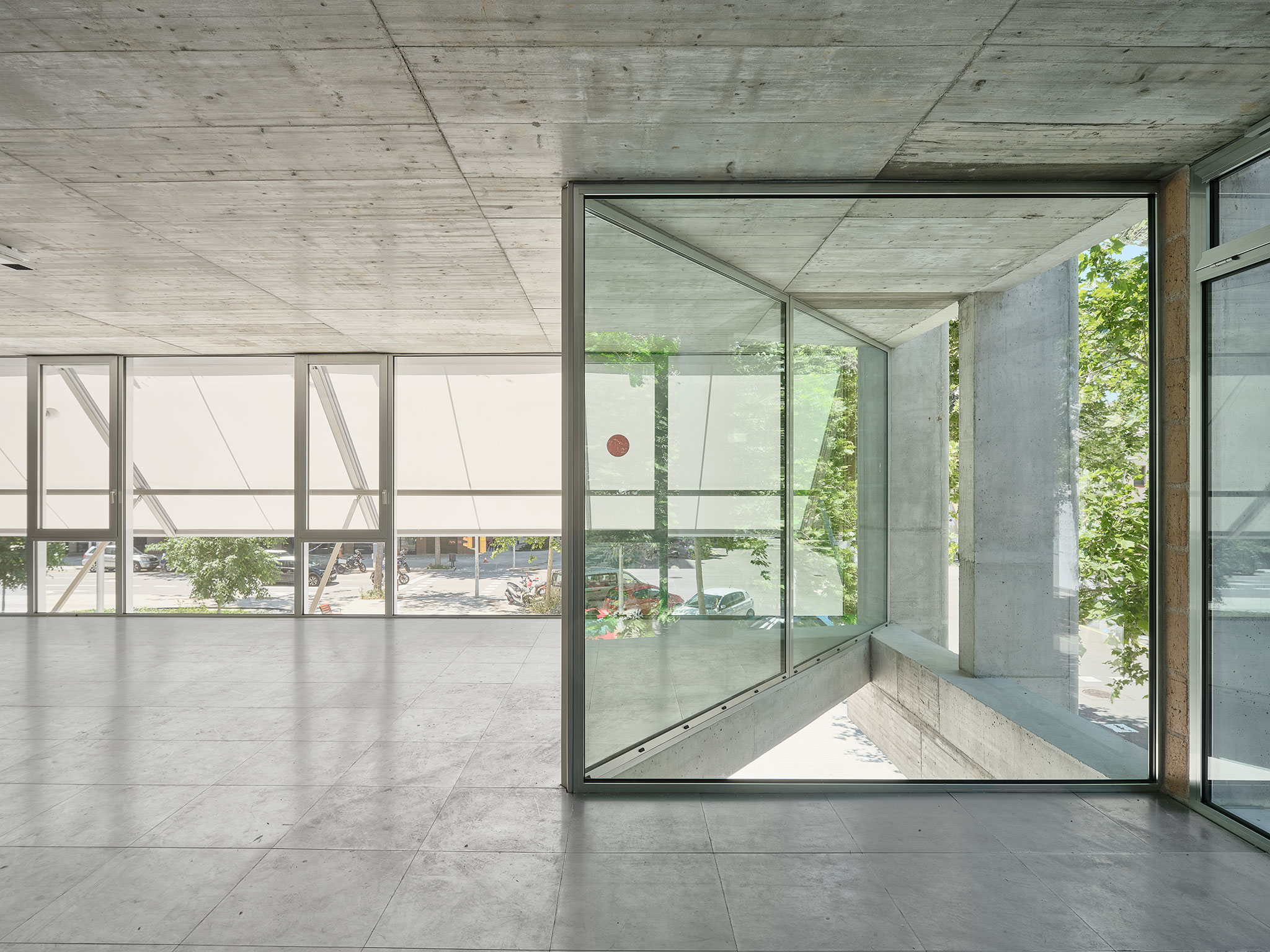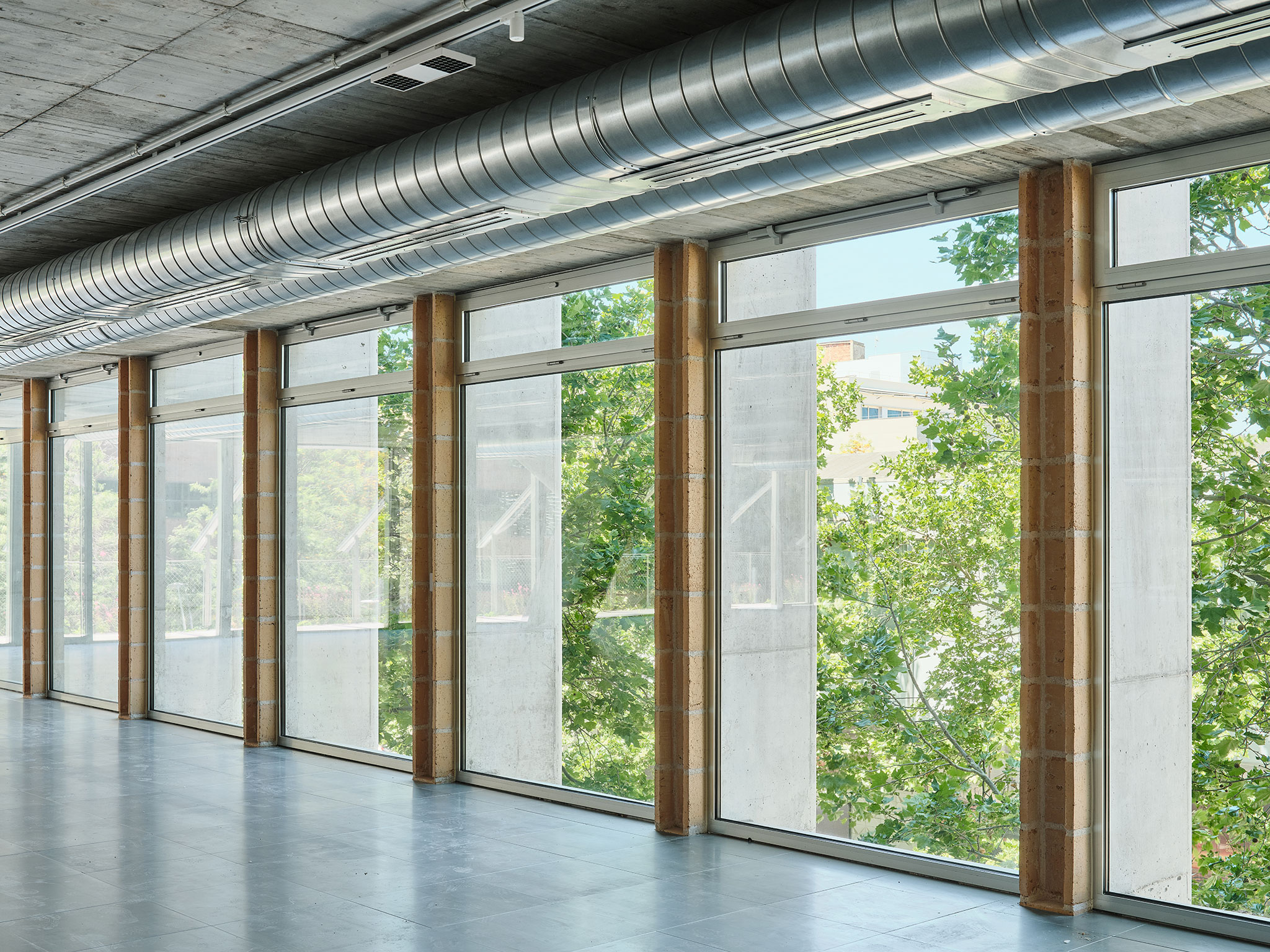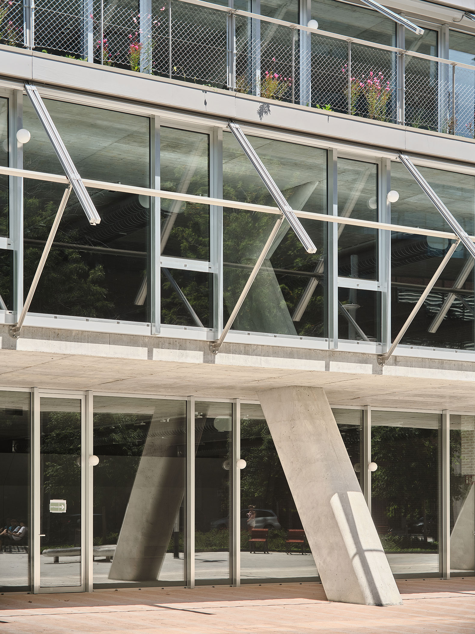 El edificio apuesta firmemente por un comportamiento termodinámico que garantice un consumo mínimo de energía, basado en la protección solar, la ventilación mediante ventanas superiores automatizadas y la inercia térmica del hormigón.