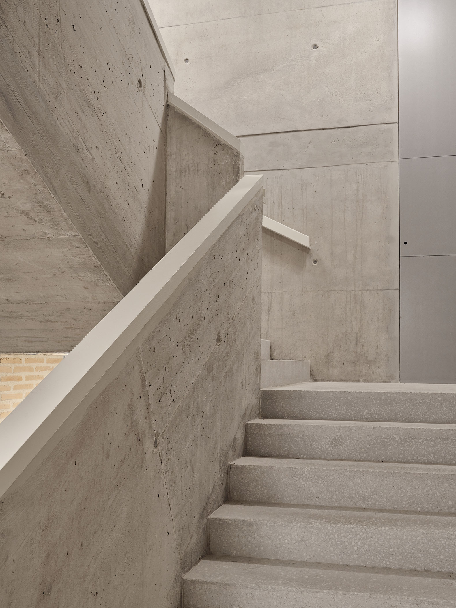 El núcleo adosado a la medianera también se construye en hormigón y alberga la escalera, los ascensores, los baños y dos patios verticales abiertos al exterior y accesibles, donde se ubican todas las instalaciones necesarias, dejando así los techos de hormigón de los espacios de trabajo ordenados y limpios.