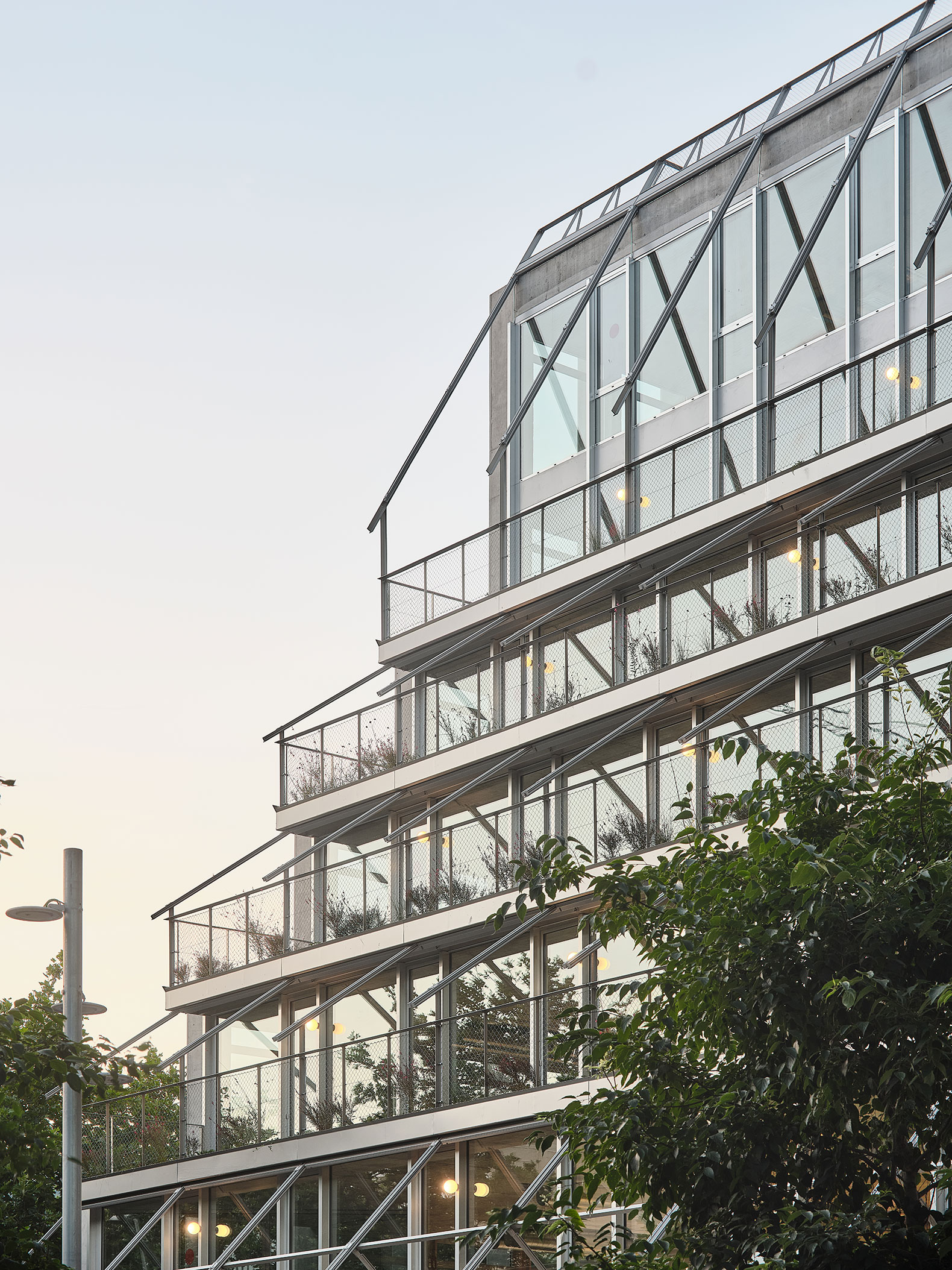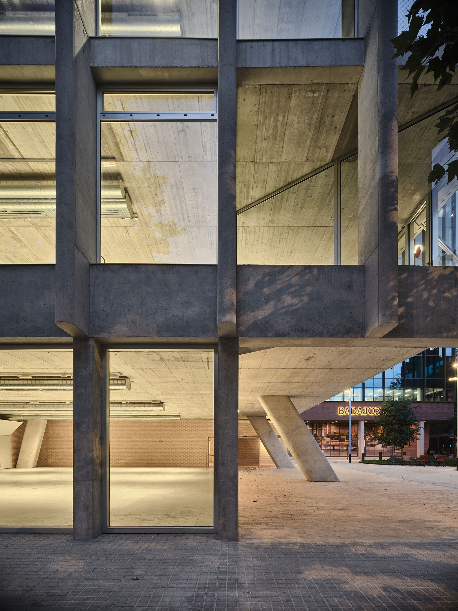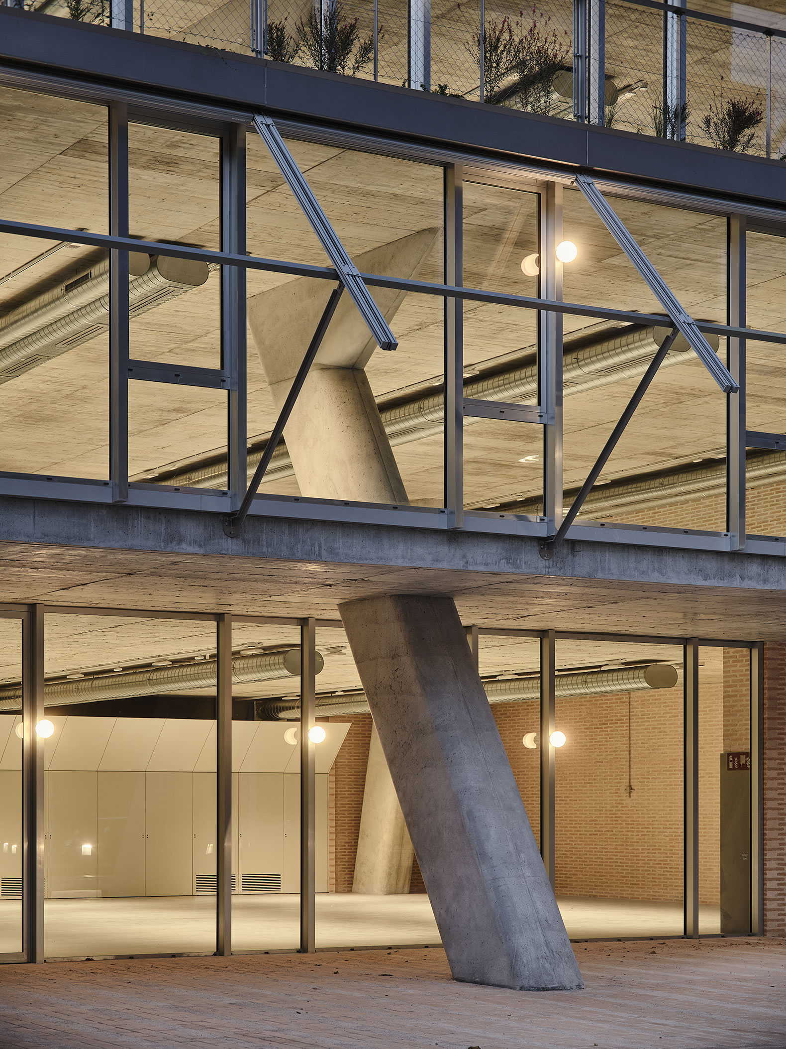 La estructura portante de hormigón acompaña esta forma, construyendo dos grandes pilares inclinados que sostienen todo el edificio.