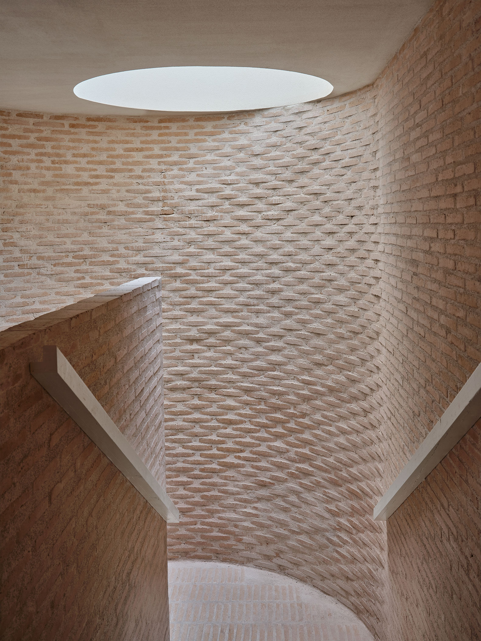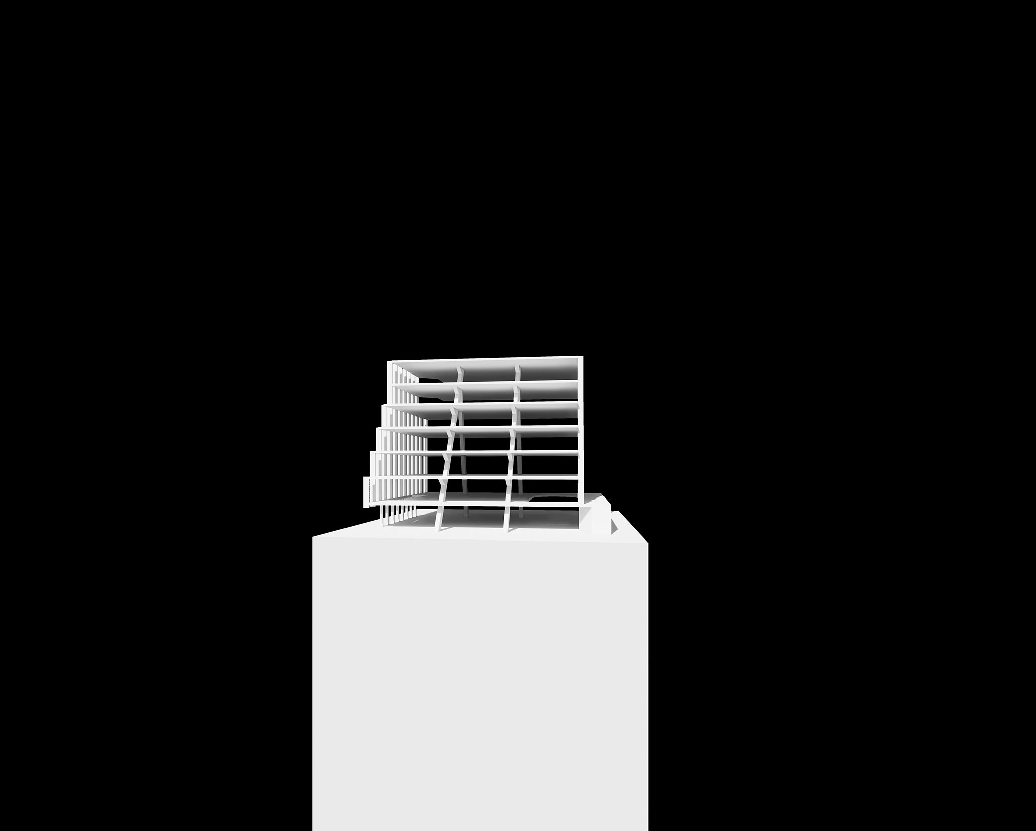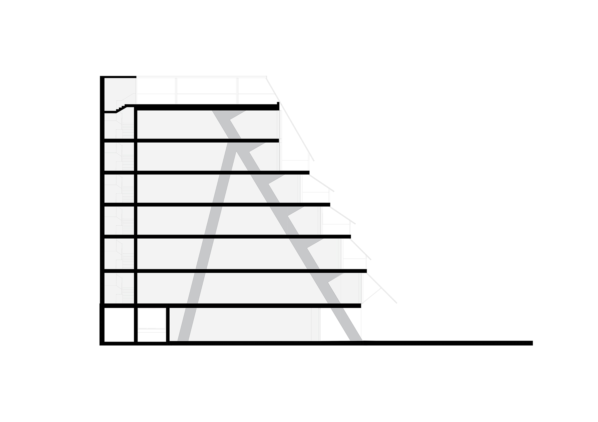 La estructura portante de hormigón acompaña esta forma, construyendo dos grandes pilares inclinados que sostienen todo el edificio.