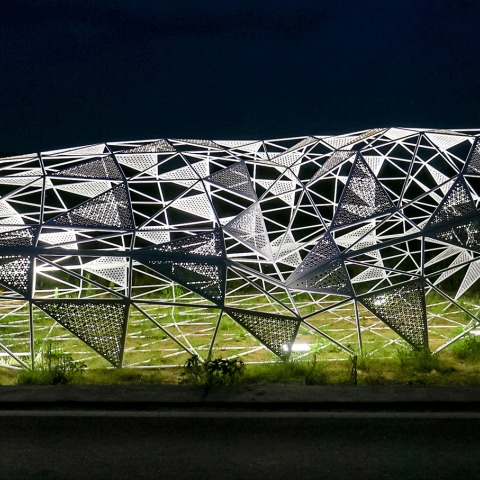 El patrón de encaje detallado de la «almohada» se ha creado a través de un diseño paramétrico con metal soldado, lo que le da al trabajo una textura suave similar a la tela, lo que da como resultado sombras ricas y en constante cambio bajo la luz del sol cambiante. Cuando los visitantes ingresan al interior de la obra y experimentan la diferencia desde una vista externa, los cambios aportan una calidad estética a la atmósfera de la estructura y sugieren infinitas vistas del paisaje.