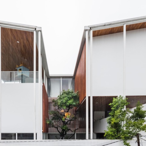 Las habitaciones se encuentran cubiertas por un gran techo que se inclina hacia el jardín interior de la casa, permitiendo el paso del aire a través de la edificación y contribuyendo a reducir la humedad del ambiente. Además, la madera ayuda no solo a garantizar la privacidad de sus moradores, sino que protege contra la potente luz veraniega del trópico.