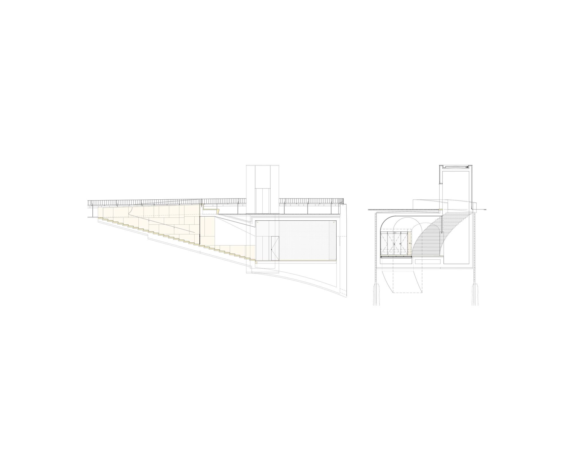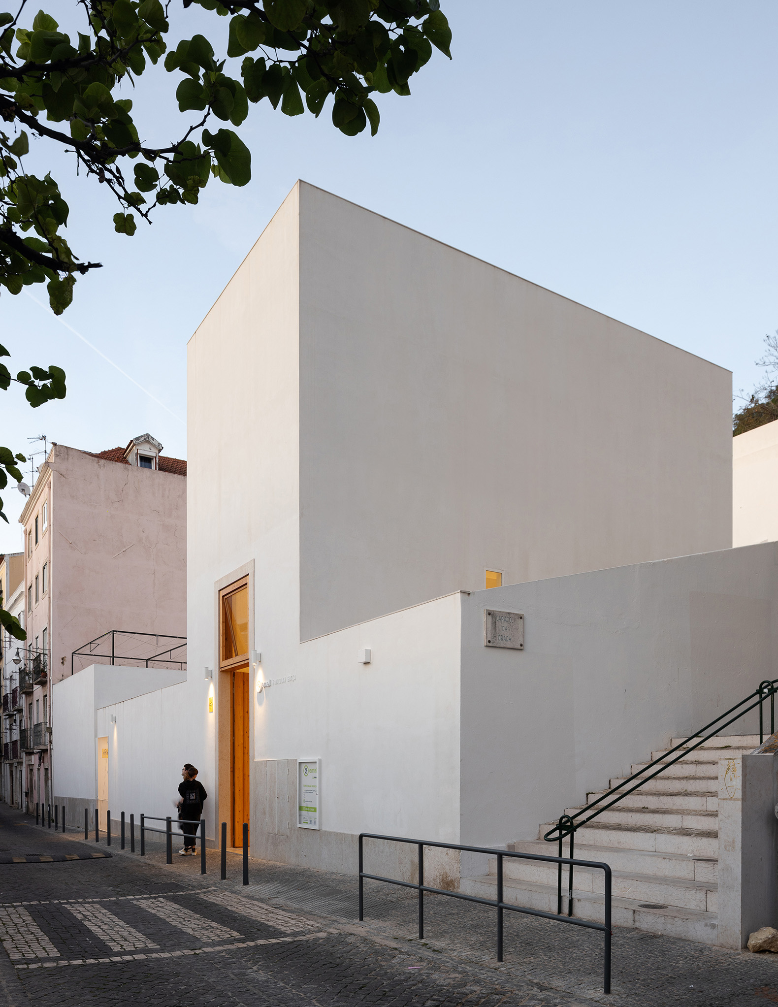La referencia tipológica para este funicular fue, en muchos aspectos, el Ascensor Bica, que respondió a muchas de las preguntas que nos planteamos sobre este equipamiento. En la planta baja, continuando la fachada de la Rua dos Lagares, un edificio abre una gran puerta a la calle. Esta entrada pública permite el acceso entre la calle y el funicular a través de un edificio de «estación», donde se almacena el equipamiento cuando no se utiliza y se recibe a los pasajeros antes de comenzar su viaje.