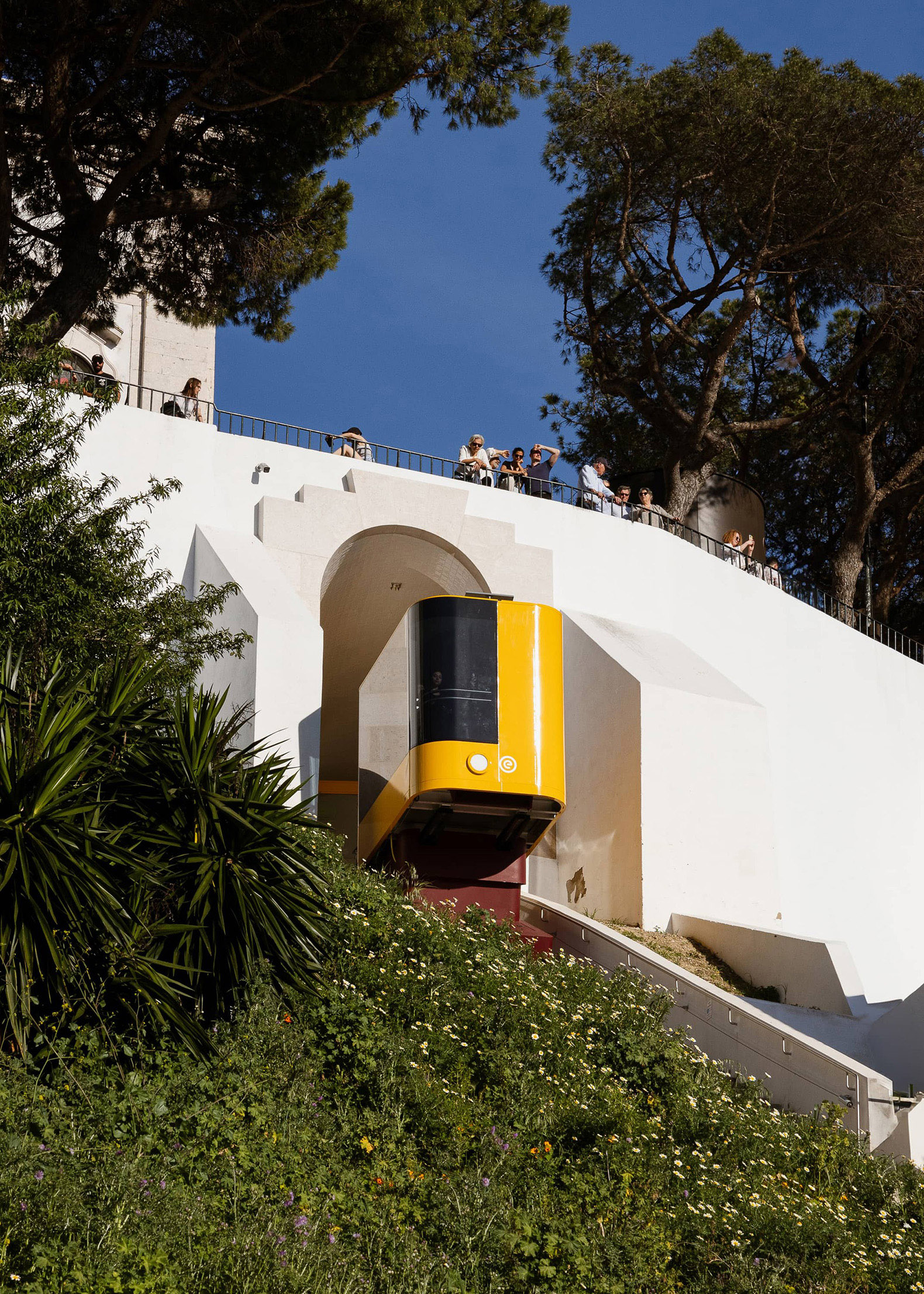 El interior de la cerca se está transformando en un jardín público. El primer tramo del recorrido discurre junto a la valla y atraviesa el nuevo jardín en un ascenso continuo. A continuación, el funicular entra en un pequeño túnel curvo que cruza el mirador para llegar al nivel que conecta con la Calçada da Graça. El funicular aparece entonces en la calle, dando la espalda al muro de contención del mirador, y se abre al Jardín Augusto Gil y al río que se divisa en el horizonte de la Calçada da Graça.