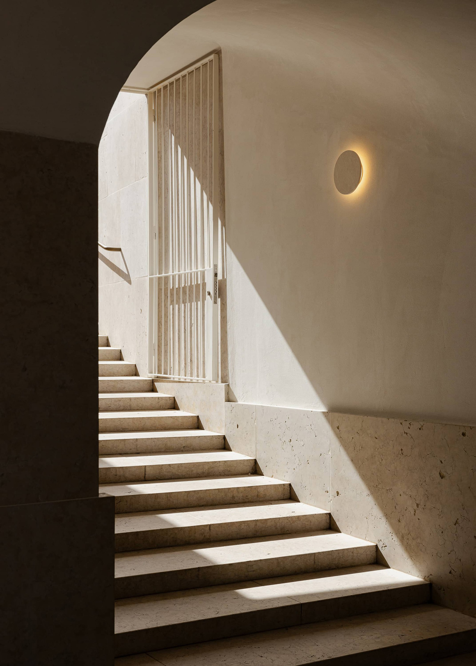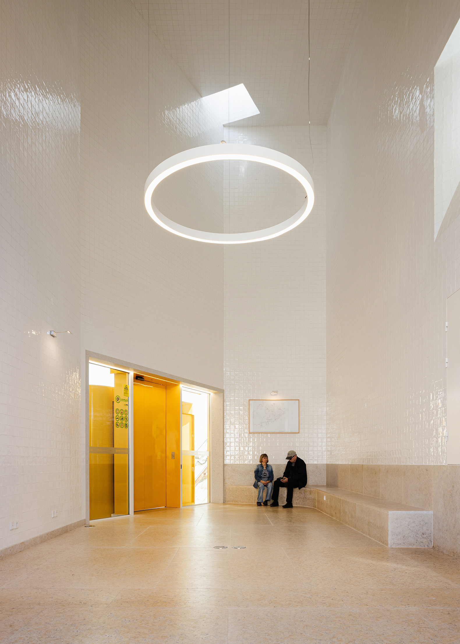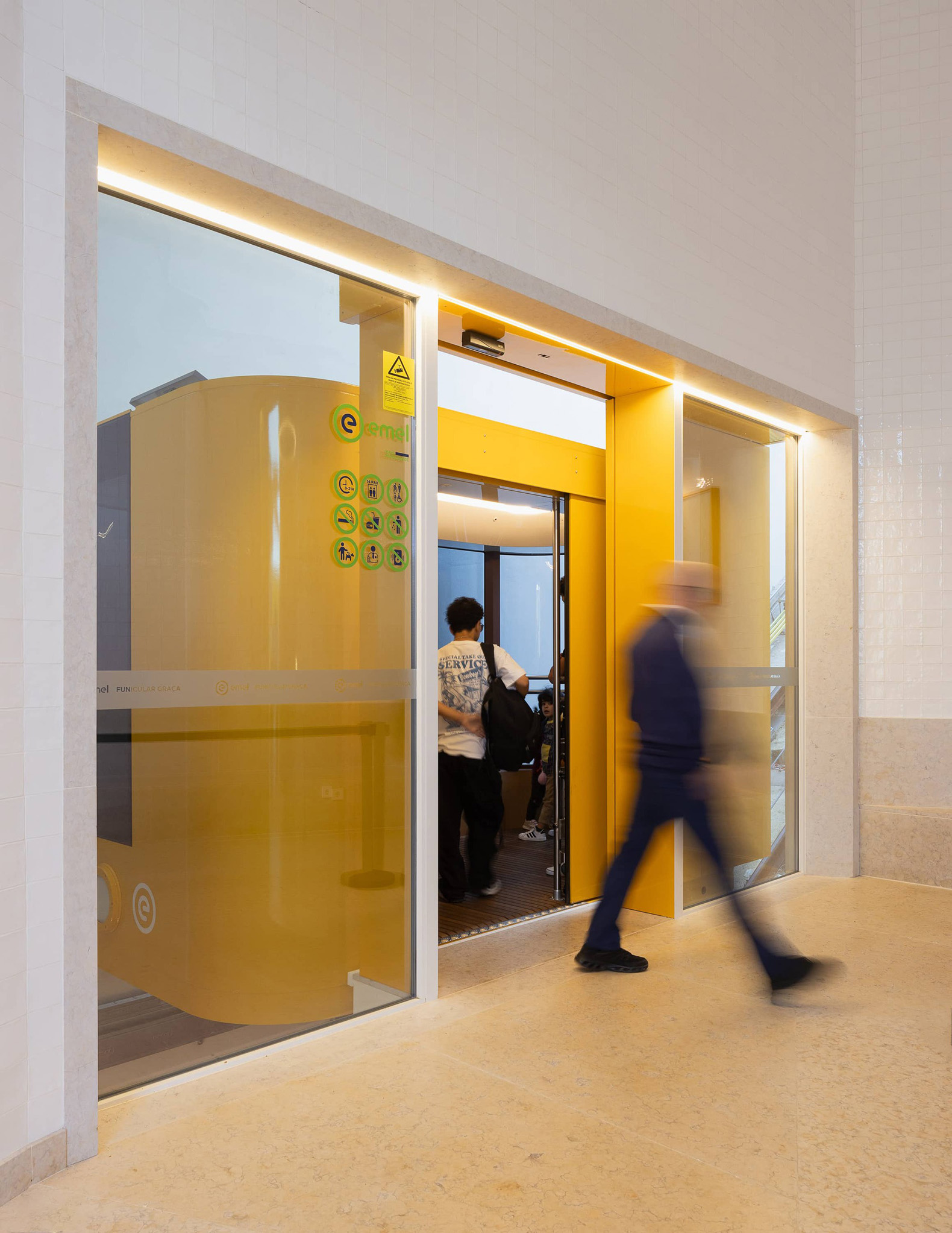 El proyecto desarrollado por Atelier Bugio comprende únicamente dos paradas, garantizando así un flujo eficiente de personas. En la planta baja, la Rua dos Lagares marca el inicio del trayecto; en la planta superior, al final de la Calçada da Graça, se sitúa la estación final, ligeramente por debajo del nivel del mirador. Esta disposición permite que el funicular se detenga en la calle antes de iniciar el descenso, en un gesto similar al del Ascensor da Bica.