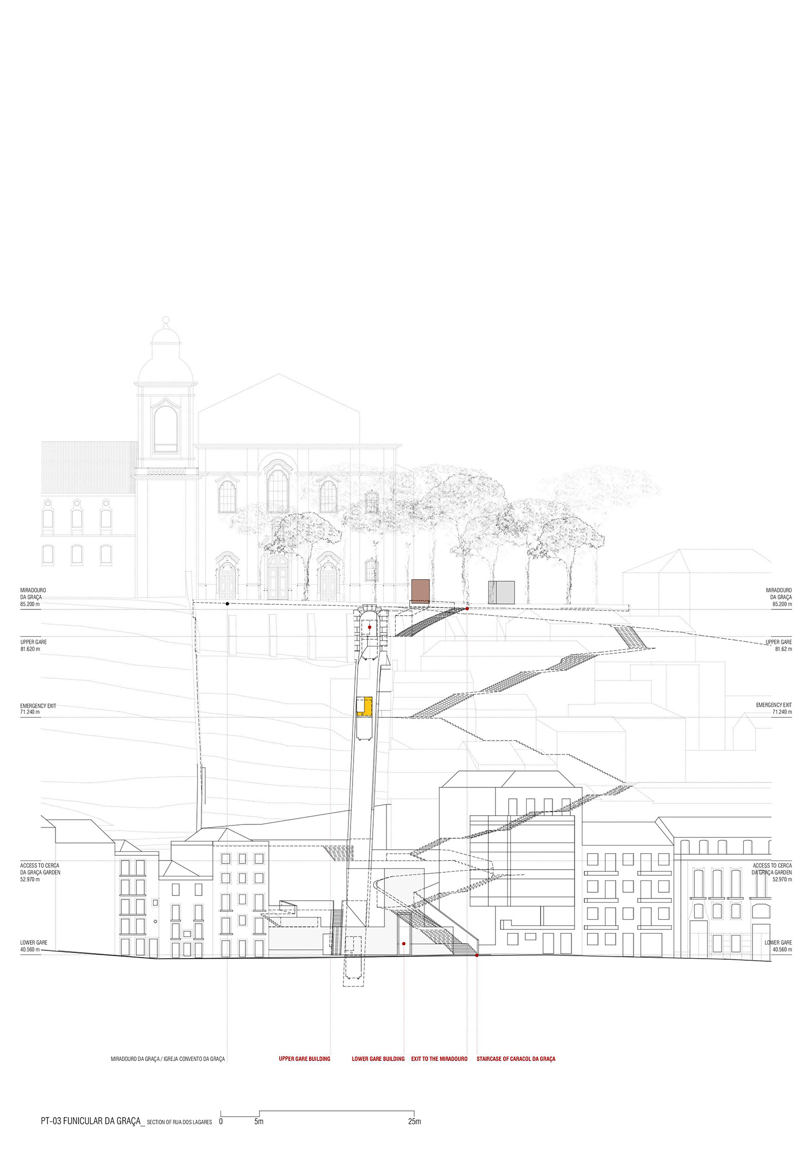 En la planta baja, en la Rua dos Lagares, un pequeño edificio de «estación» continúa la fachada de la calle y conecta el recorrido del funicular con la calle mediante un espacio de doble altura. El edificio alberga el mecanismo y crea una «puerta» a Graça. La cabina del funicular está diseñada con un eje que la divide en dos secciones: la sección opaca, que contiene dos puertas (una de emergencia y otra para pasajeros) y la sección transparente, que ofrece a los pasajeros una vista del interior del recinto del Convento durante todo el recorrido, ya que el recorrido discurre paralelo a ella.