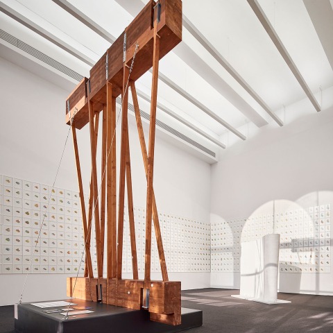 Su investigación considera las narraciones integradas en el material y su distribución que se relacionan con cuestiones sociales, políticas, económicas y filosóficas más amplias. La madera de madera jugó un papel generador para su proyecto Writers Theatre, completado en 2016 en Glencoe, Illinois. Aquí se presenta una maqueta a escala real de la estructura de madera que Studio Gang diseñó para apoyar el paseo del dosel del vestíbulo del teatro.