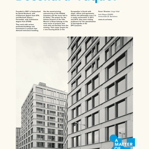 Bosshard Vaquer Architekten es un joven despacho catalano-suizo que inicia su trayectoria profesional en el 2001, después de ganar su primer concurso en Zúrich. Posteriormente desarrolla su trabajo en varios edificios protegidos y monumentos, que requieren este acercamiento cuidado al extremo y meticuloso, como la galardonada reestructuración del Cementerio Sihlfeld, la sala de música de St Galler y el proyecto para el Istituto Svizzero de Roma. No abandonan su filosofía de trabajo, retomar lo existente para transformarlo, incluso en edificios de construcción reciente, como ocurre en el que es actualmente su proyecto más importante: un nuevo bloque de viviendas en la Europaallee de Zurich, con tiendas, oficinas y apartamentos. Daniel Booshard y Meritxell Vaquer son profesores de Rehabilitación en la EPF-Lausanne.