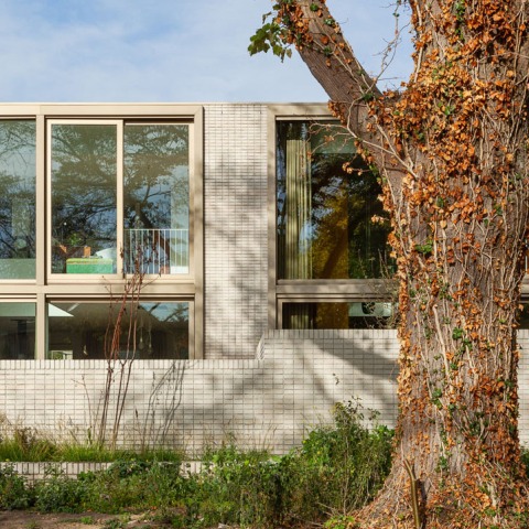 Para obtener una expresión tranquila de un edificio, cuyo énfasis principal se encuentra en el carácter espacial de todo el conjunto, el ladrillo parece ser un material de construcción preciso. A través de su color claro (blanco con un tinte amarillo) se logra un máximo de reflexión de la luz, lo que reduce el impacto visual del asentamiento denso. Los ladrillos se utilizan de manera que no se requiere un revestimiento de metal adicional alrededor de las elegantes ventanas verticales de la fachada norte. El tipo de ladrillo ha sido especialmente desarrollado en colaboración con un fabricante de ladrillos alemán. La visibilidad de las juntas de dilatación necesarias en el ladrillo aislado, así como las juntas entre las paredes del jardín de carga y el ladrillo de carga de las fachadas aisladas, se debían minimizar al mínimo. El ladrillo se combina con ventanas de aluminio anodizado bronce con vidrio de protección solar y filtros solares grisáceos integrados. El resultado es un conjunto modesto con una generosidad sorprendente. Su materialización sólida pero a la vez luminosa recuerda las urbanizaciones clásicas de mediados del siglo XX del siglo XX.
