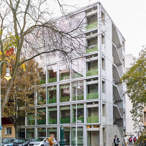El "Wohnregal" es un edificio de 6 pisos en Berlín que alberga talleres de trabajo/vivienda. Se construyó utilizando elementos de hormigón prefabricado comunes en la construcción de almacenes industriales: pilares, vigas y techos TT (elementos de techo, incluyendo dos vigas). La elección de esta técnica de construcción en serie se basaba en la ambición de superar dos desafíos aparentemente contradictorios a los que se enfrenta el mercado de la vivienda en Berlín. Por un lado, la prefabricación industrial ofrece los beneficios de las técnicas de construcción en serie (ahorro de costes y plazos de construcción más cortos) y, por lo tanto, aborda el aumento de los costes de construcción de viviendas. Los costes de construcción de 1500 euros/m2 para el "Wohnregal" eran muy bajos en el contexto alemán. Así, también, fue el tiempo de construcción de 6 semanas para el montaje in situ de la cáscara completa del edificio (1 semana por piso). Pero contra las ideas preconcebidas de que la construcción en serie implica automáticamente una estandarización de la propia unidad habitable, el "Wohnregal" al mismo tiempo ofrece una amplia gama de diferentes diseños de talleres en vivo/ trabajo para un ancho de banda cada vez mayor de estilos de vida urbana.