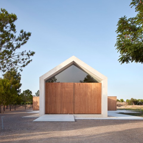 El acceso a la parcela es un recorrido a través de un camino envuelto en olivos. Al fondo se divisa la casa, escondida entre agrupaciones de cipreses, chopos y pinos. La entrada a la vivienda se realiza a través de una de las cajas. El espacio central de hormigón forma una zona común fluida a la que vuelcan el resto de las estancias y queda presidida por una gran chimenea. En el interior, las vistas quedan enmarcadas en los volúmenes de pino que se clavan invadiendo el espacio central. Al concebirse como una segunda residencia, tanto las cajas como los porches se cierran totalmente cuando la vivienda no está habitada.