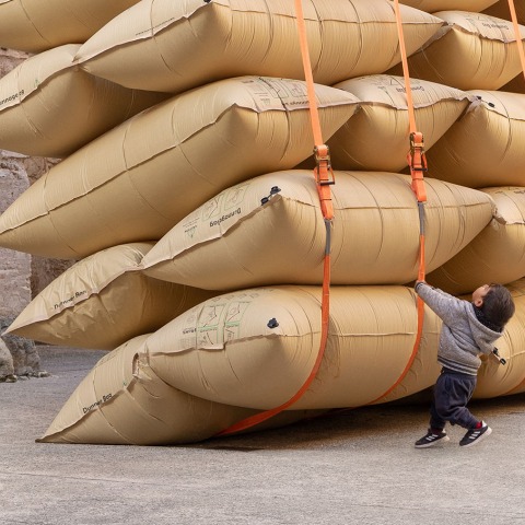 Para ello se utilizan ciento veinte sacos de aire comercializados habitualmente para la fijación de mercancía en contenedores de transporte. La ejecución parte de una superposición de diez hileras cosidas en taller formando un aparejo irregular. El diseño desestima la forma tradicional de construcción de muros de mampostería por adición de piezas, para proponer un desplante por propulsión, hinchado desde abajo, hasta alcanzar los siete metros de altura.