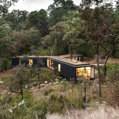 La casa tiene tres volúmenes dispuestos para parecerse a una forma de Y, los arquitectos han usado árboles caídos y muertos encontrados alrededor de esta casa para imprimir su superficie exterior de hormigón, que está pintada de negro para ayudar a camuflarla entre el bosque.