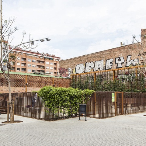 La arquitecta Anna Codina recibió el encargo de dar un uso provisional a este espacio urbano. Un espacio de juego y esparcimiento para los perros de los vecinos, que en una ciudad densa como Barcelona se convierte en todo un lujo. El proyecto, respondiendo a su temporalidad combina materiales de construcción con jardinería, de manera inteligente consiguiendo que su mantenimiento sea mínimo.