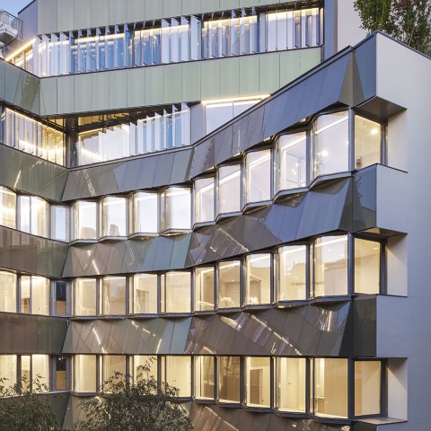 Los matices de colores y reflejos de los vidrios no son caprichosos. Los situados en la fachada sur están retranqueados y protegidos del sol directo de verano, mientras que los situados a norte se asoman hacia afuera, buscando la luz. Los vidrios curvos siguen la tradición de las bow-windows que conseguían maximizar el espacio y la luz natural en el interior y en las fachadas superiores expuestas a oeste, se plantea una doble piel de lamas de vidrio con control solar, permitiendo las vistas de los tejados de Madrid.