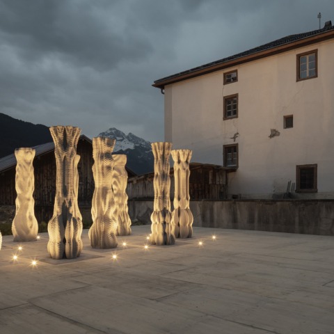 En colaboración con el Festival Origen en Riom, Suiza, la instalación "Coreografía de hormigón" es un proceso de impresión 3D desarrollado en ETH Zúrich que se ha utilizado para producir nueve columnas de hormigón diseñadas individualmente.