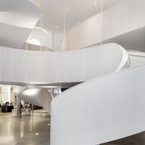 En el centro del espacio, dentro de un impresionante espacio de doble altura, se despliega la circulación vertical. La envolvente del edificio se creó como una capa de alto rendimiento en términos de desarrollo sostenible. Los paneles de vidrio translúcido cubren una envoltura de acero inoxidable, los paneles de vidrio cerámico controlan la ganancia solar y los paneles transparentes ofrecen vistas directas del sitio y proporcionan luz natural para los espacios de trabajo, relajación y lectura.