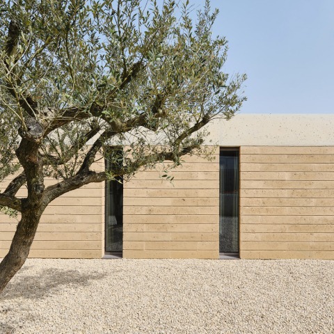 El proyecto se articula alrededor de un patio con una vista abierta al paisaje. Una casa compacta, desarrollada en planta baja con un nivel inferior dedicado a los servicios. La finca se caracteriza por una fuerte pendiente; la casa se coloca de manera que los espacios exteriores se escalonan y se conectan entre ellos, creando relaciones visuales que fragmentan la compacidad de la casa.