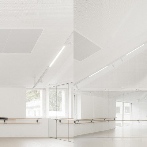 - Los estudios de baile son muy luminosos y luminosos. El sonido está confinado y la luz se difunde. La luz entra a través de la luz del techo (proyectada desde el sol), a través de las grandes ventanas hacia el este que dan vistas completas a los árboles en el patio de recreo, ya través de una ventana clerestory horizontal al sur situado sobre el espejo, iluminando a los bailarines y permitiendo Para ver claramente sus reflexiones. Estos espacios de baile tienen un plano rectangular, casi cuadrado, pero un volumen asimétrico para una mejor acústica y para permitir la ventilación natural (efecto de pila).