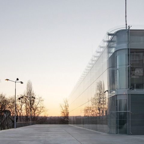 El acristalamiento estructural externo está diseñado principalmente como una protección acústica eficaz contra el ruido de una carretera de circunvalación de seis carriles en las inmediaciones del edificio. La fachada de doble piel permite la ventilación natural y la protección solar regulada del espacio interior. Las esquinas redondeadas de vidrio son un vínculo con la arquitectura original.