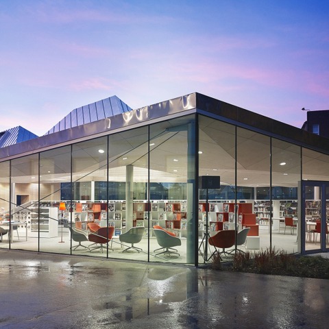 Una pared de vidrio envuelve toda la construcción para proteger térmica y acústicamente el espacio interior, pero permite a los lectores de todas las edades vistas a los variados jardines que rodean la estructura, lo que hace que se sientan como en un espacio exterior en una zona de colorida vegetación.