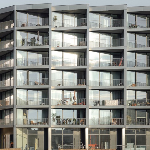 El C14 es el edificio más reciente de la trama urbana de Buiksloterham y se erige como un objeto abstracto de apariencia mística en el paseo marítimo de Tolhuiskanaal. Uno de los rasgos definitorios de nuestro diseño es su fachada de acero, que cumple varias funciones a la vez. De un solo golpe, la secuencia de balcones dentados crea los espacios exteriores protegidos para los nuevos residentes, maximiza la entrada de luz natural a través de los grandes ventanales y la cruda identidad del edificio.