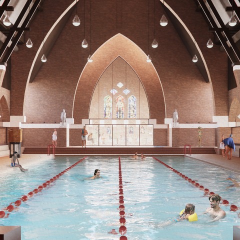 «La tasa de desocupación de las iglesias está aumentando, por lo que necesitamos generar ideas nuevas y creativas para estos edificios. ¿Por qué no devolverles la función social que solían tener? Una piscina pública es ideal para esto. Imagine nadar de espaldas con vistas a la bóveda de la iglesia y sus vidrieras. Al cubrir toda la zona de la piscina con una pequeña capa de agua, se crea un hermoso efecto visual, permitiendo que la iglesia recupere su forma original y parezca aún más grande e imponente a través del reflejo».