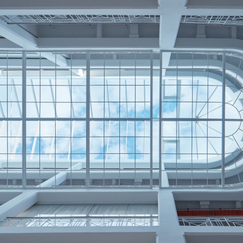 El espacio de las galerías se ha dividido al máximo posible mediante paredes de vidrio para que siga fluyendo libremente e interactuando con el espacio central del atrio. La forma y las proporciones de los estudios de transmisión, la sala de control y los estudios de autoservicio surgieron de la posibilidad de integrarse en la estructura básica existente. El proyecto y la materialidad de los estudios están subordinados a las necesidades de la acústica espacial, prevalece el color blanco como en todo el edificio, con una franja de azul cielo nocturno – éter por donde se propagan las ondas de radio.