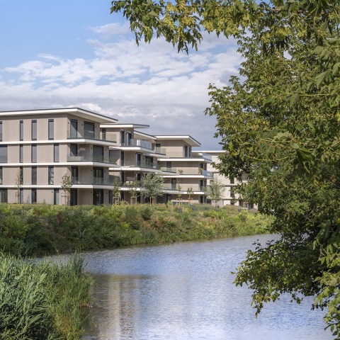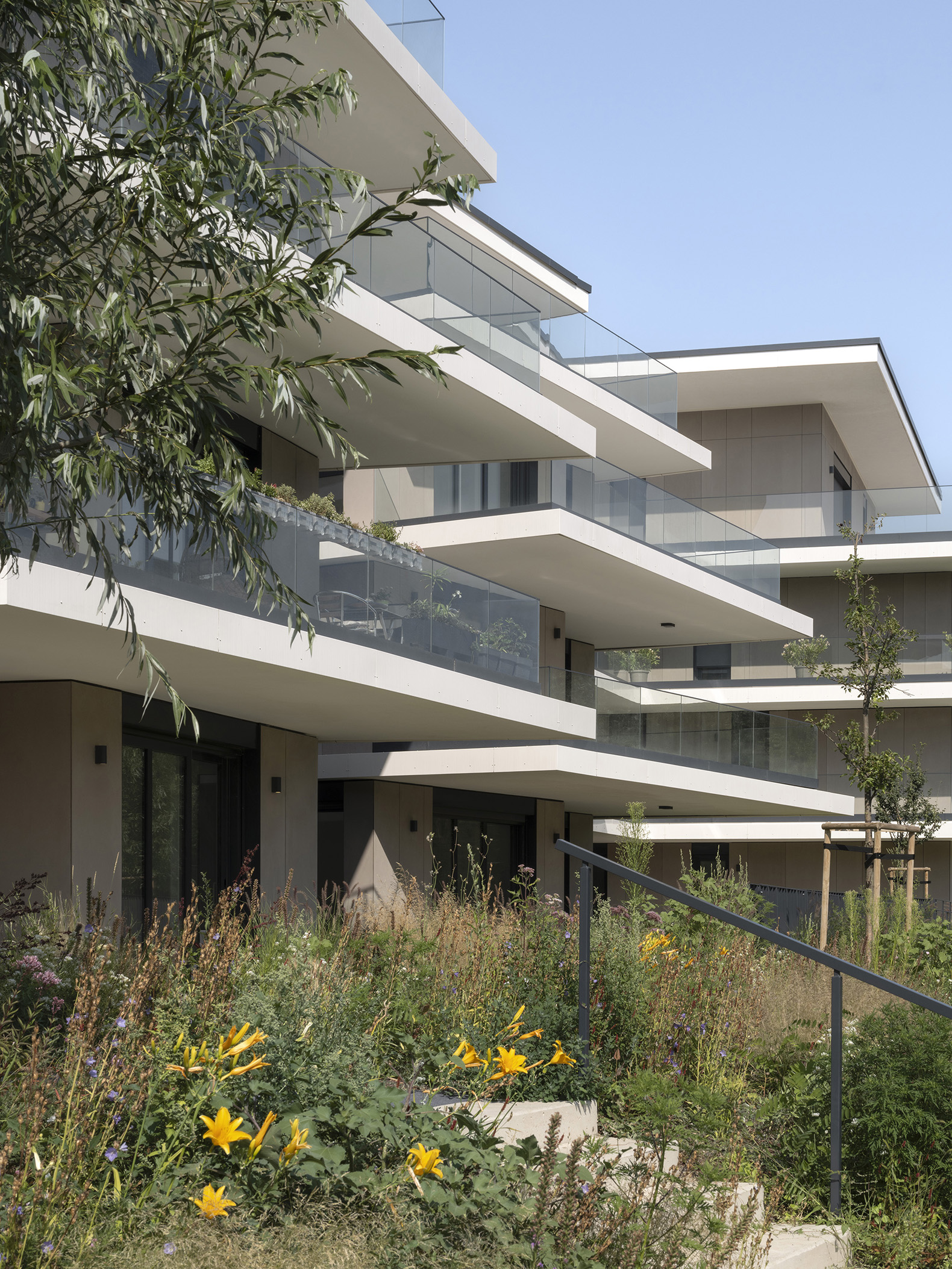 En consonancia con la filosofía de Coldefy, que combina naturaleza y arquitectura para mejorar el bienestar y la calidad de vida, cada apartamento cuenta con un espacio exterior privado en forma de balcón o terraza. Además, el diseño potencia la luz natural y las vistas al lago y al paisaje circundantes, minimizando las vistas directas a los edificios vecinos para garantizar la privacidad de los residentes. Cada edificio está diseñado para adaptarse a su ubicación, con volúmenes escalonados que se adaptan al terreno, minimizando la densidad del conjunto.