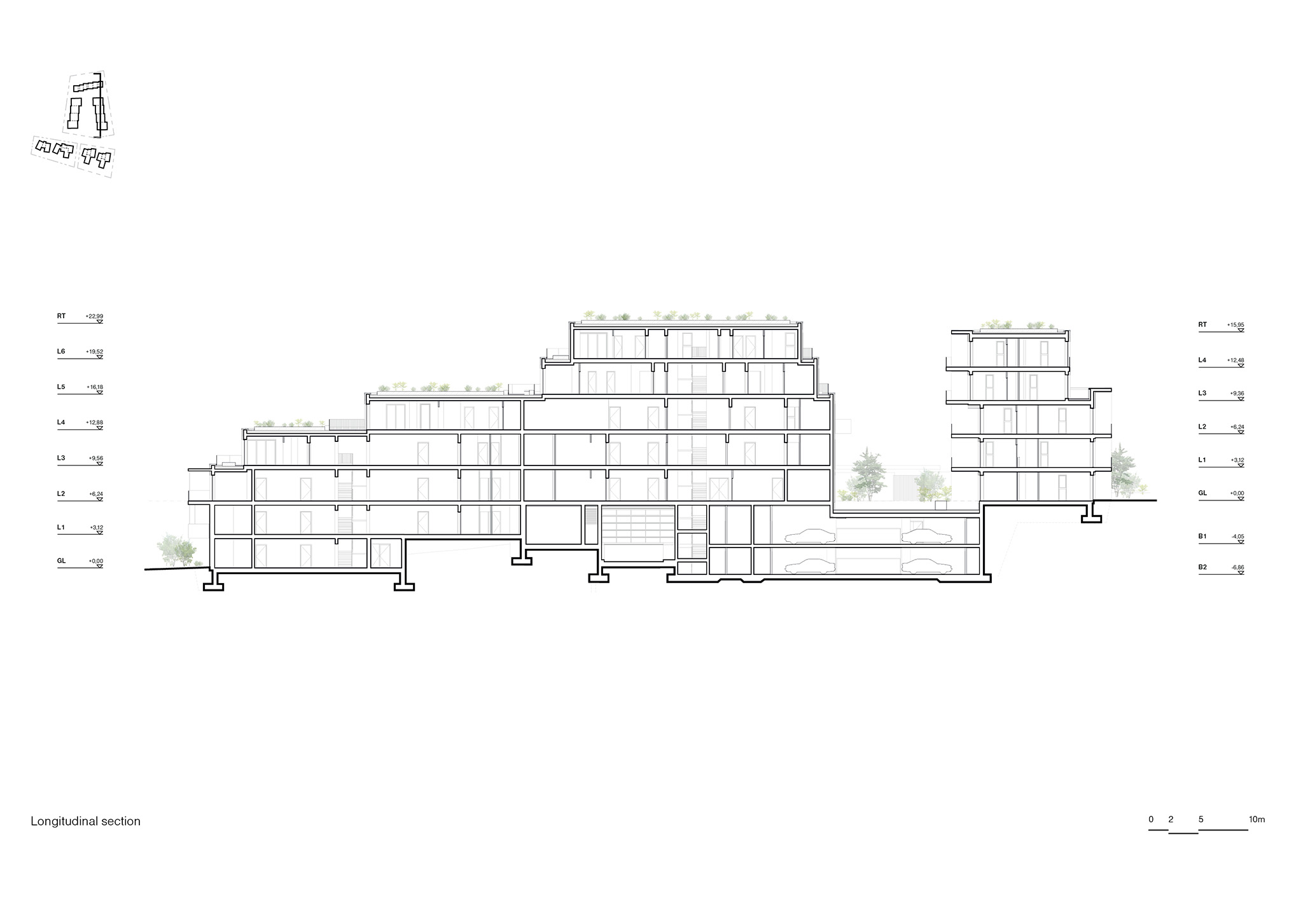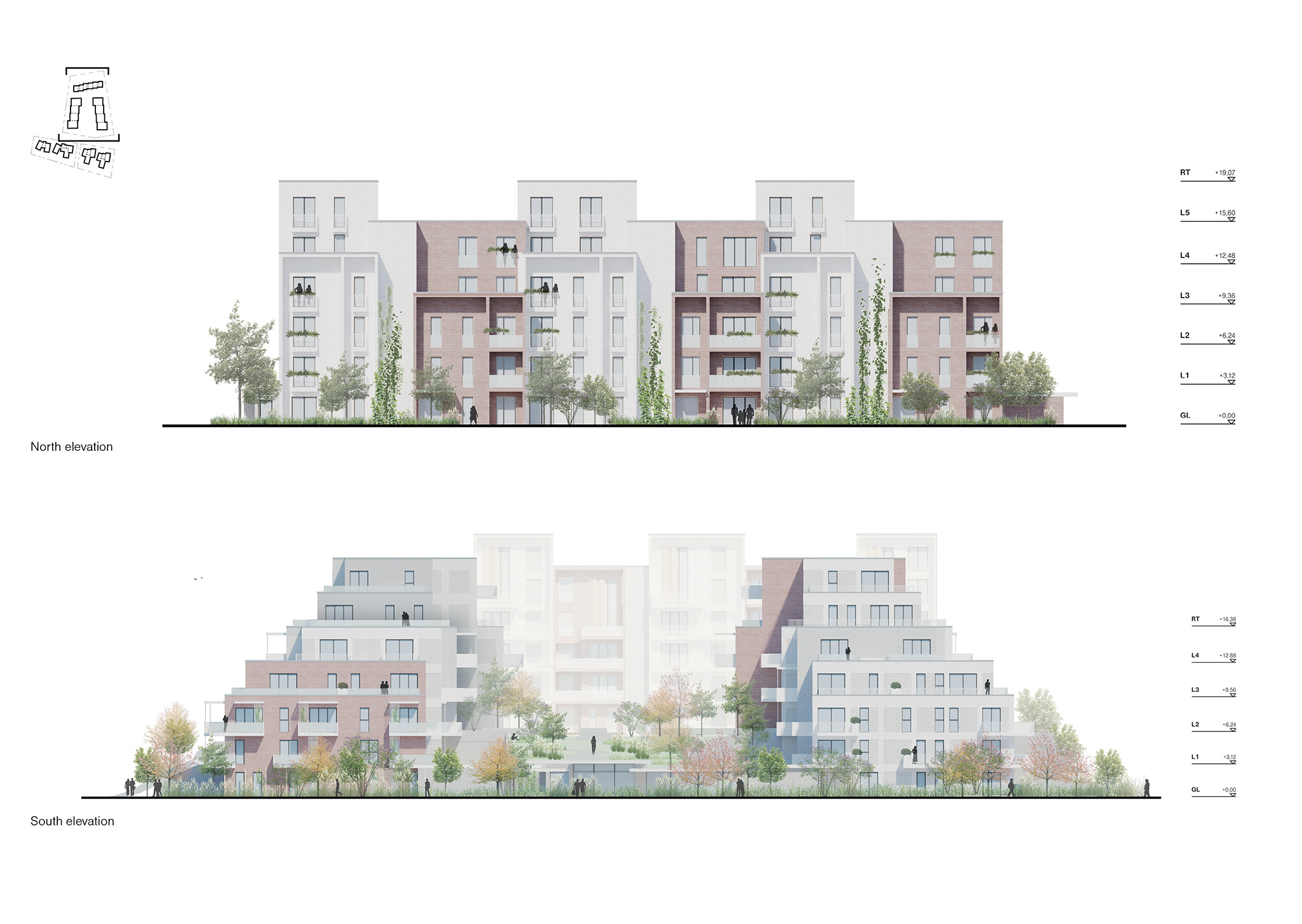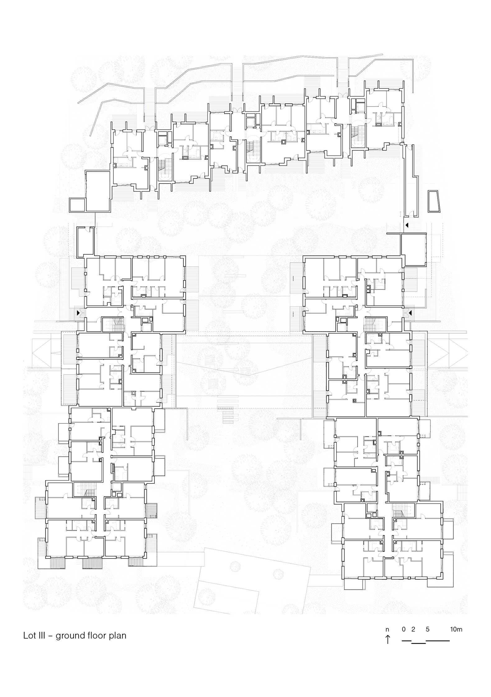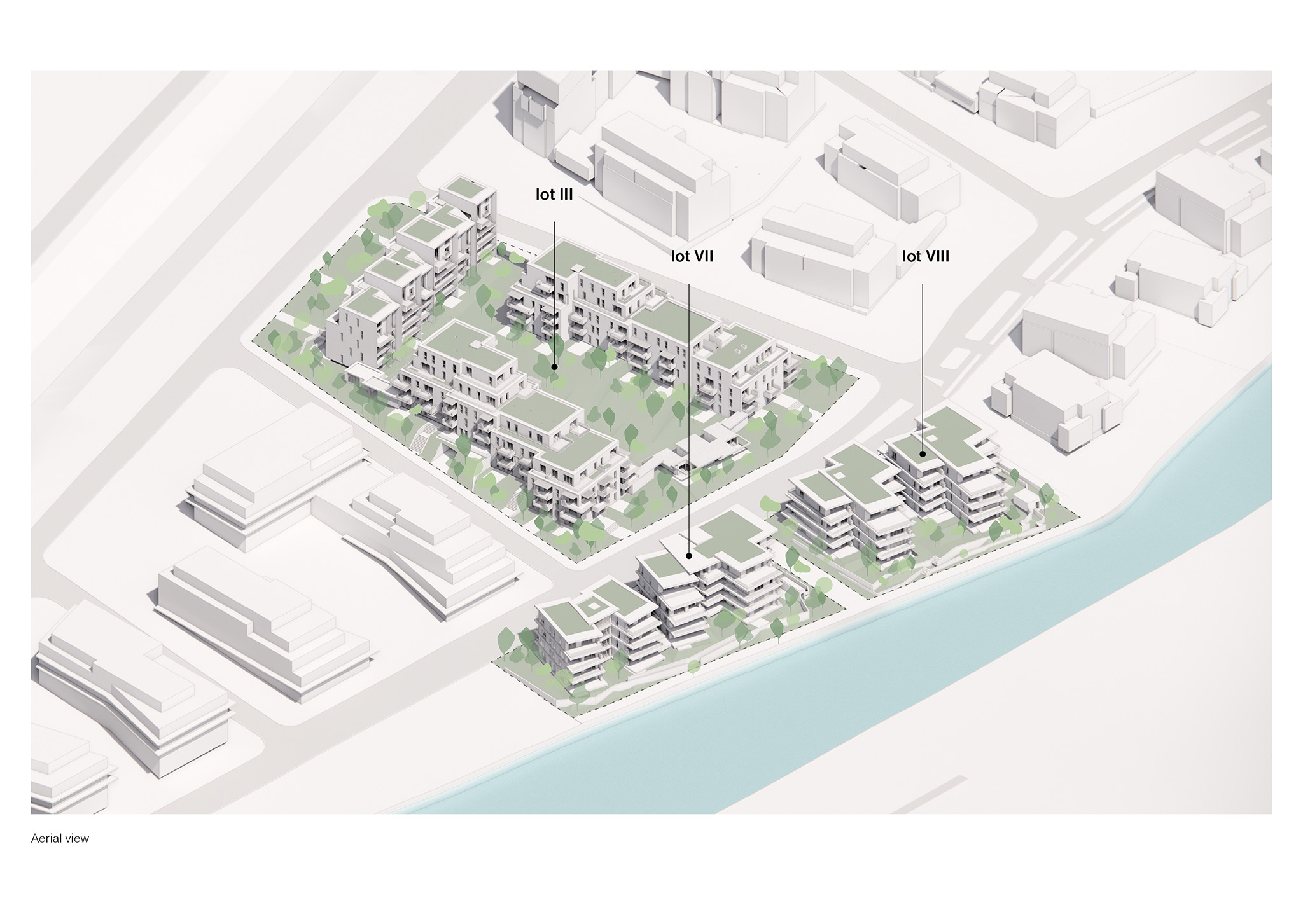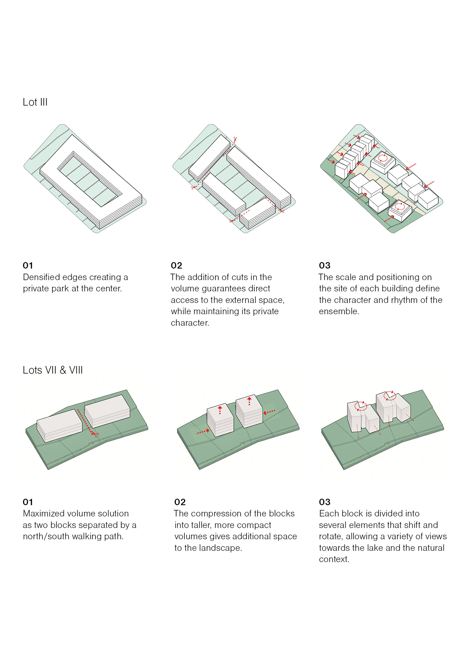 La propuesta de Coldefy y DDS se adapta a las dos parcelas asignadas al proyecto con una configuración formal que contribuye a crear un conjunto coherente. La disposición en forma de «U» en la primera parcela permite la creación de un espacio comunitario abierto volumétricamente por sus esquinas y delimitado hacia el sur por la intervención en la segunda parcela, paralela al lago. El espacio interior, proyectado siguiendo estratégicas transiciones entre áreas públicas, semipúblicas y privadas, ha recibido un cuidadoso tratamiento natural dispuesto en una ladera escalonada, con un paisajismo respetuoso con la biodiversidad y plantas locales.