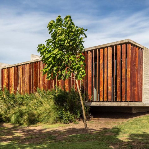 Hacia el exterior la casa se cierra en tres de sus lados con pantallas construidas con tablas de madera de quebracho en posición vertical que filtran las vistas desde ambas calles y desde el predio vecino, consiguiendo intimidad en todos los ambientes y el control de la incidencia del sol en las diferentes orientaciones. La fachada hacia el fondo propio se abre totalmente a través de grandes ventanales y una amplia galería con pérgola.