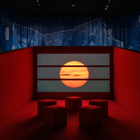 En el corazón de la muestra, una cortina azul intenso rodea una sala de cine que, inspirada en los tradicionales campamentos de invierno de Catar, proyecta una película dividida en tres pantallas, que combina imágenes de la gente de Catar junto con paisajes naturales, flora y fauna característicos del país. Las imágenes representadas en el imponente lienzo de color azul, que simula la estratificación del mar, reflejan la compleja relación que existe entre la vida humana y la vida marina.