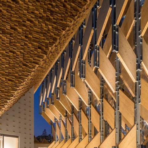 Kengo Kuma ha utilizado piezas diagonales de madera laminada cruzada (CLT) en diferentes ángulos que se apoyan en un marco de acero. El interior del pabellón no se percibe fácilmente porque la estructura luminosa y aireada está envuelta por estas piezas de madera, desdibujando los límites.