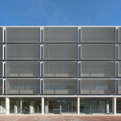 El revestimiento continuo de aluminio gris, se ve interrumpido en el alzado de poniente con unas lamas horizontales del mismo material que protegen del sol de la tarde.