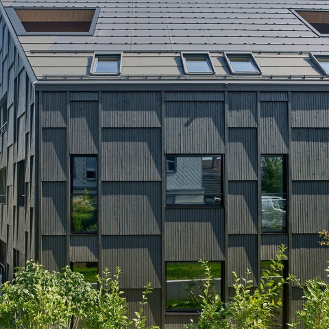 La expresión arquitectónica del nuevo edificio surge a través de un lenguaje formal simple y homogéneo. Las fachadas buscan un aspecto despejado y tranquilo. Los seis lados están tratados de la misma manera, con diferentes aperturas según su exposición. Pequeñas desviaciones en el ritmo de las pilastras verticales y en los formatos refinan las fachadas uniformemente alineadas. Los paneles de madera inclinados entre la pilastra vertical de madera dan como resultado diferentes efectos de sombras y reflejos de luz, proporcionando al volumen una apariencia viva. La proporción de ventanas varía según las fachadas. Las logias buscan exposición al sur y se integran discretamente en la geometría de la estructura. Se evitan los elementos en voladizo, como balcones y miradores.