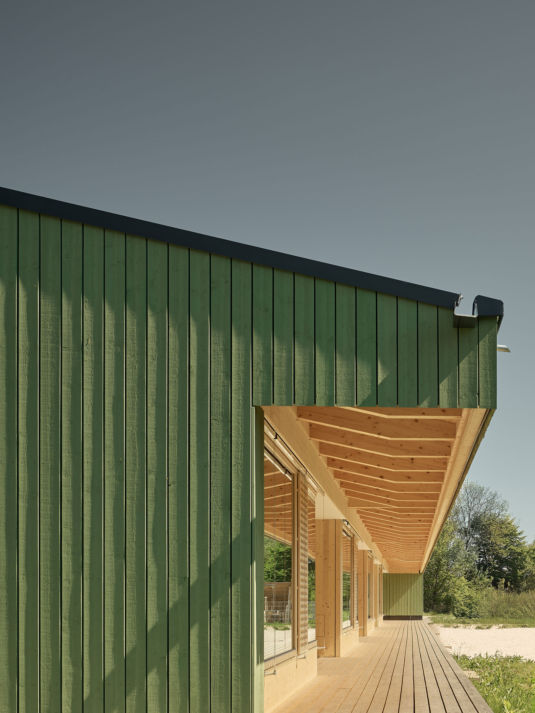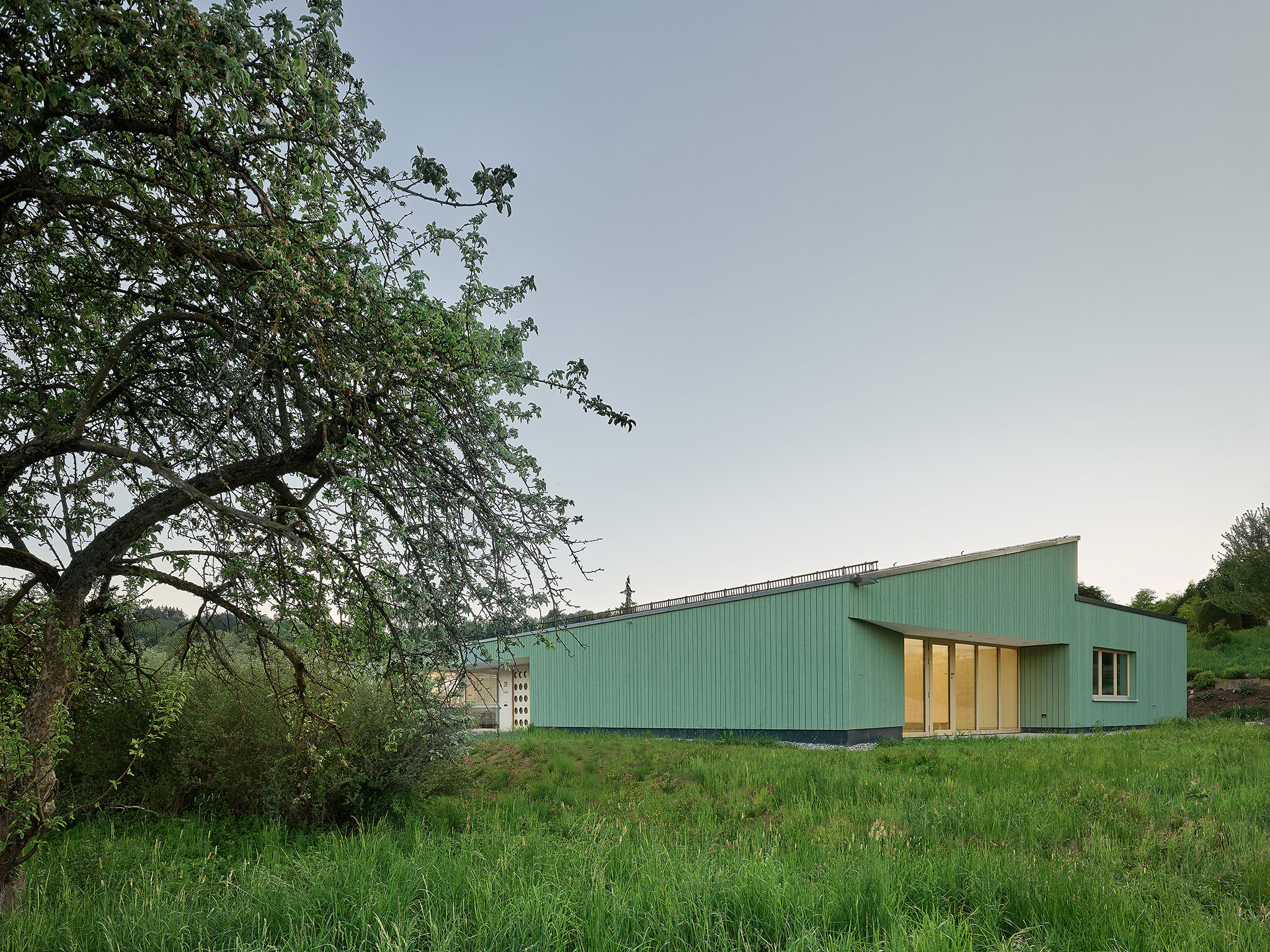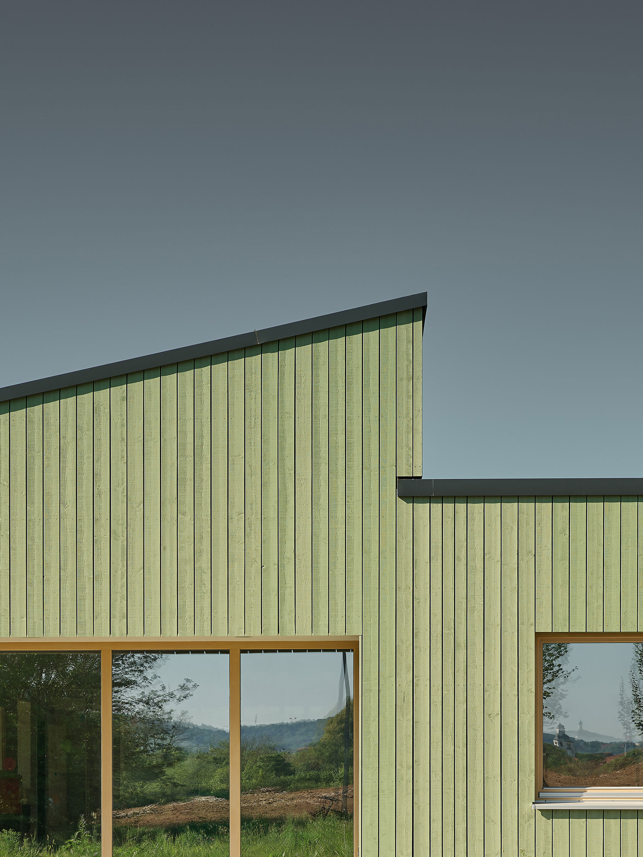 El edificio se construyó con madera, de conformidad con la norma de eficiencia energética KfW55. Solo la losa del suelo y el muro de contención norte, contra la pendiente natural, fueron de hormigón armado. La integración en el terreno permitió una reutilización óptima de la tierra excavada como material de relleno.