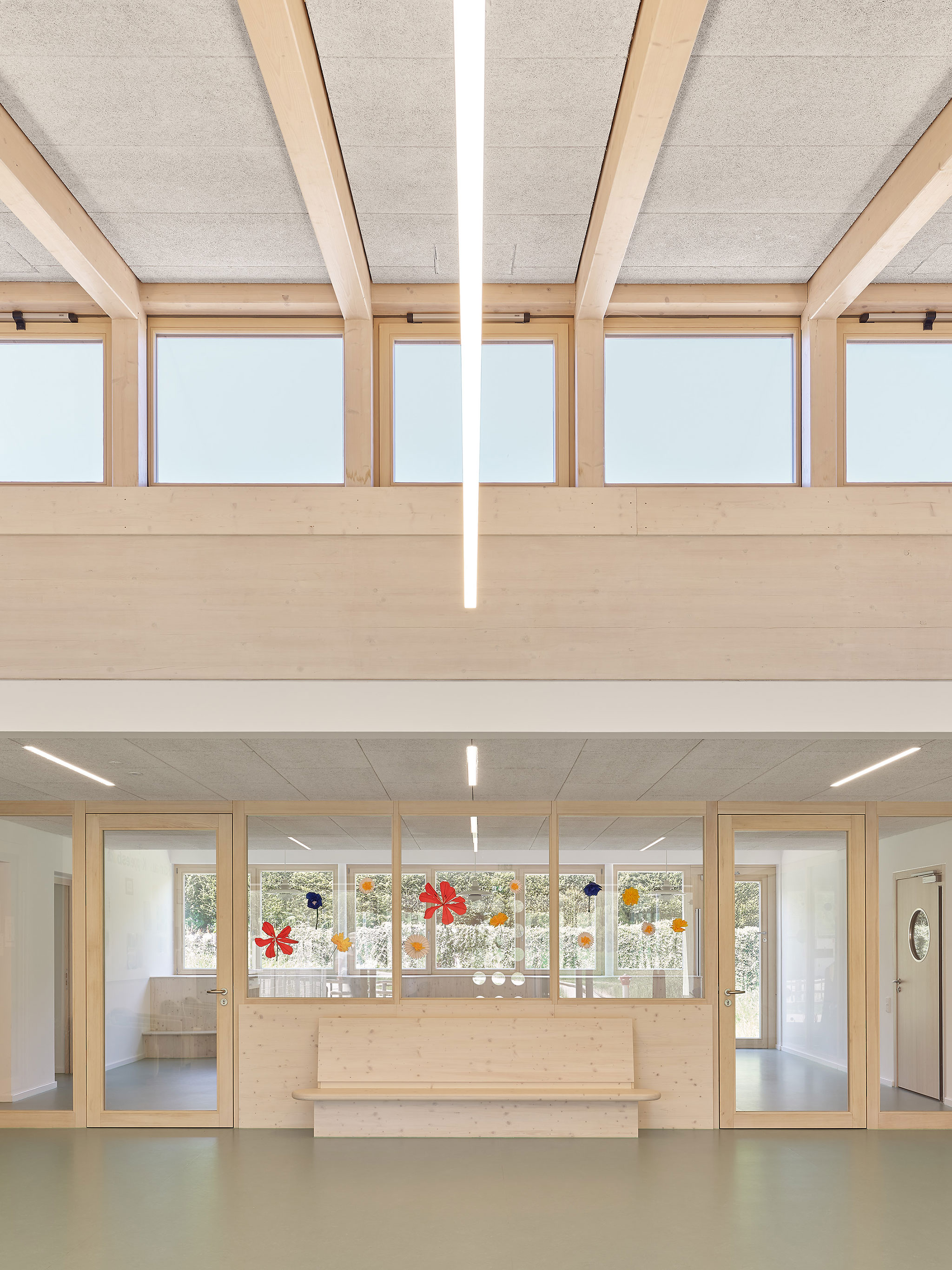 La ubicación estratégica del edificio y su estructura espacial abierta crean un entorno que fomenta el movimiento y la comunicación. Ofrece no solo un espacio protegido para los niños, sino también una sólida conexión entre el interior y el exterior. El diseño sigue un lenguaje arquitectónico claro y funcional y complementa el enfoque educativo de la institución mediante elementos arquitectónicos específicos. La combinación de formas limpias, materiales naturales y una organización funcional convierte a la nueva guardería en un lugar inspirador para el aprendizaje y la convivencia.