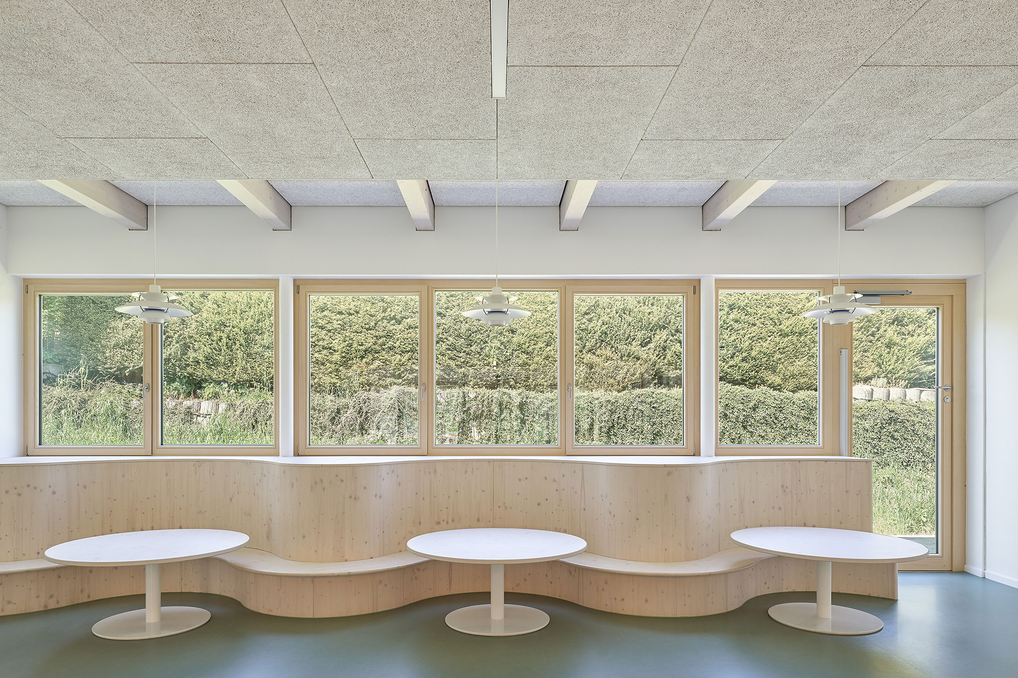 Las salas de grupo están orientadas al sur, cada una con acceso directo, protegido del sol y del clima, a la terraza y a la zona de juegos exterior. La distribución de las salas sigue un concepto claro y estructurado: un pasillo central separa las salas de grupo más animadas, en el sur, de las zonas más tranquilas, como los dormitorios y las salas creativas, en el norte. Los guardarropas y los nichos para sentarse proporcionan ritmo y orientación a lo largo del pasillo, a la vez que realzan su calidad espacial. Una secuencia de salas de grupo y zonas de guardarropa garantiza una iluminación natural uniforme en todas las zonas de circulación interna.