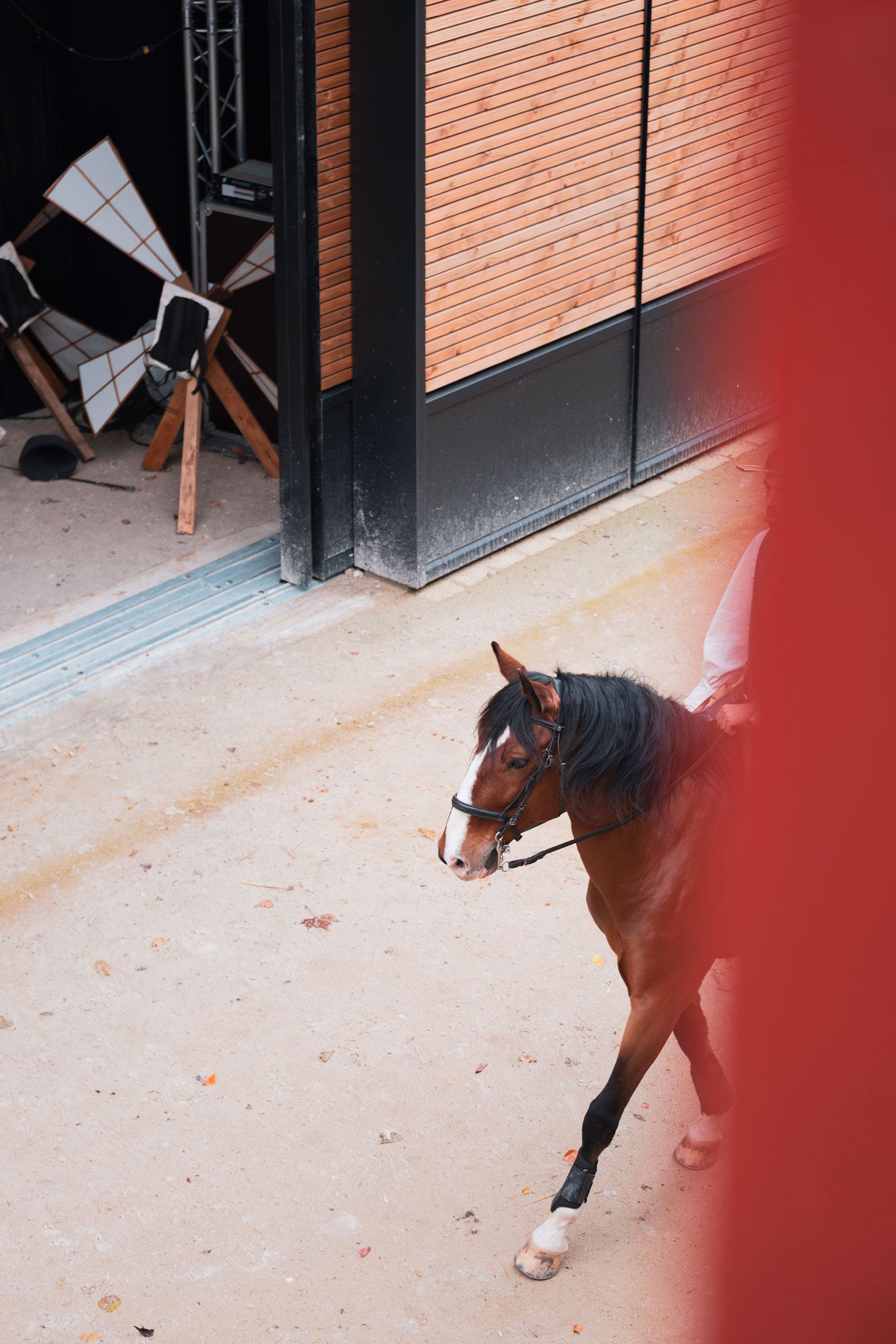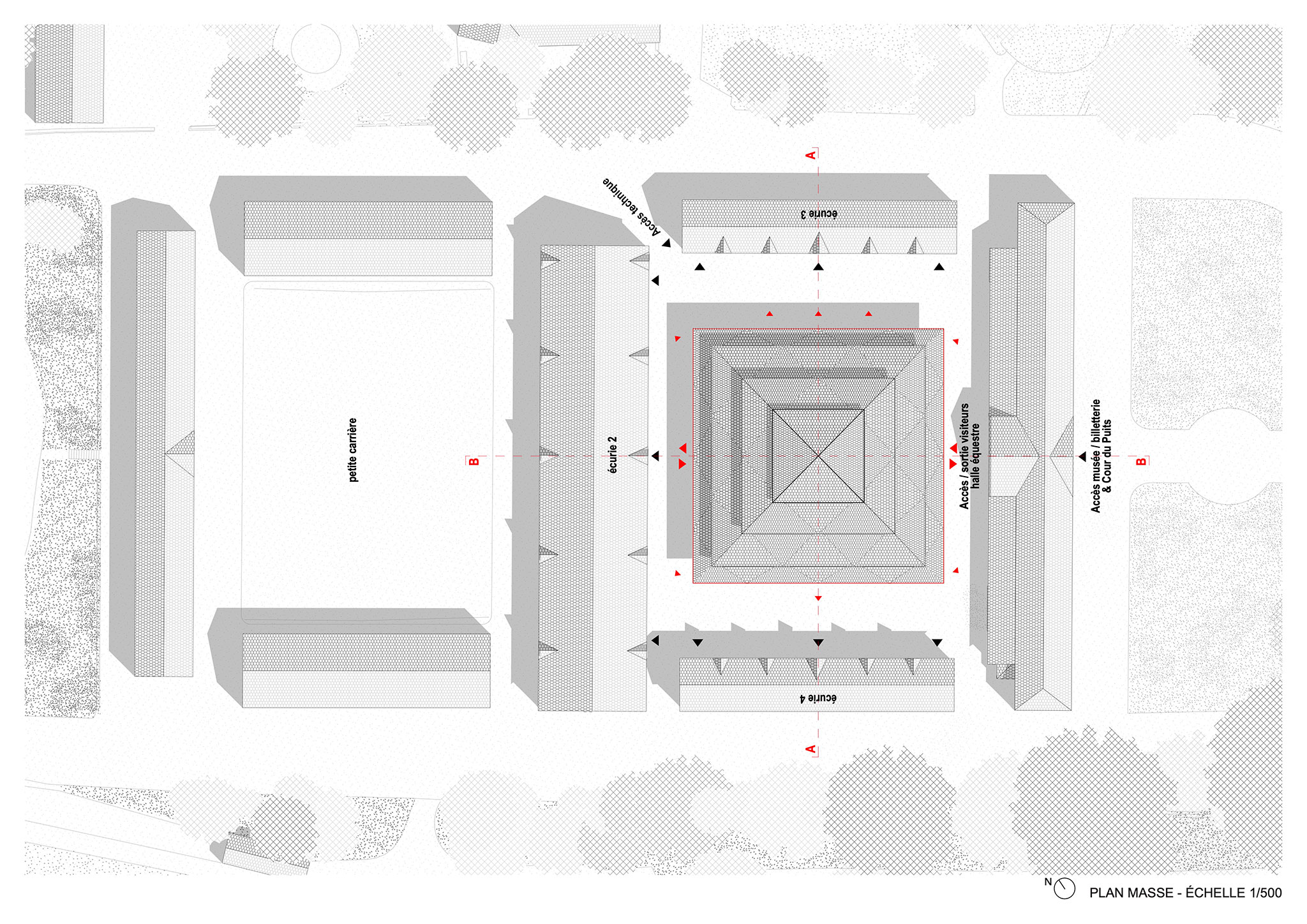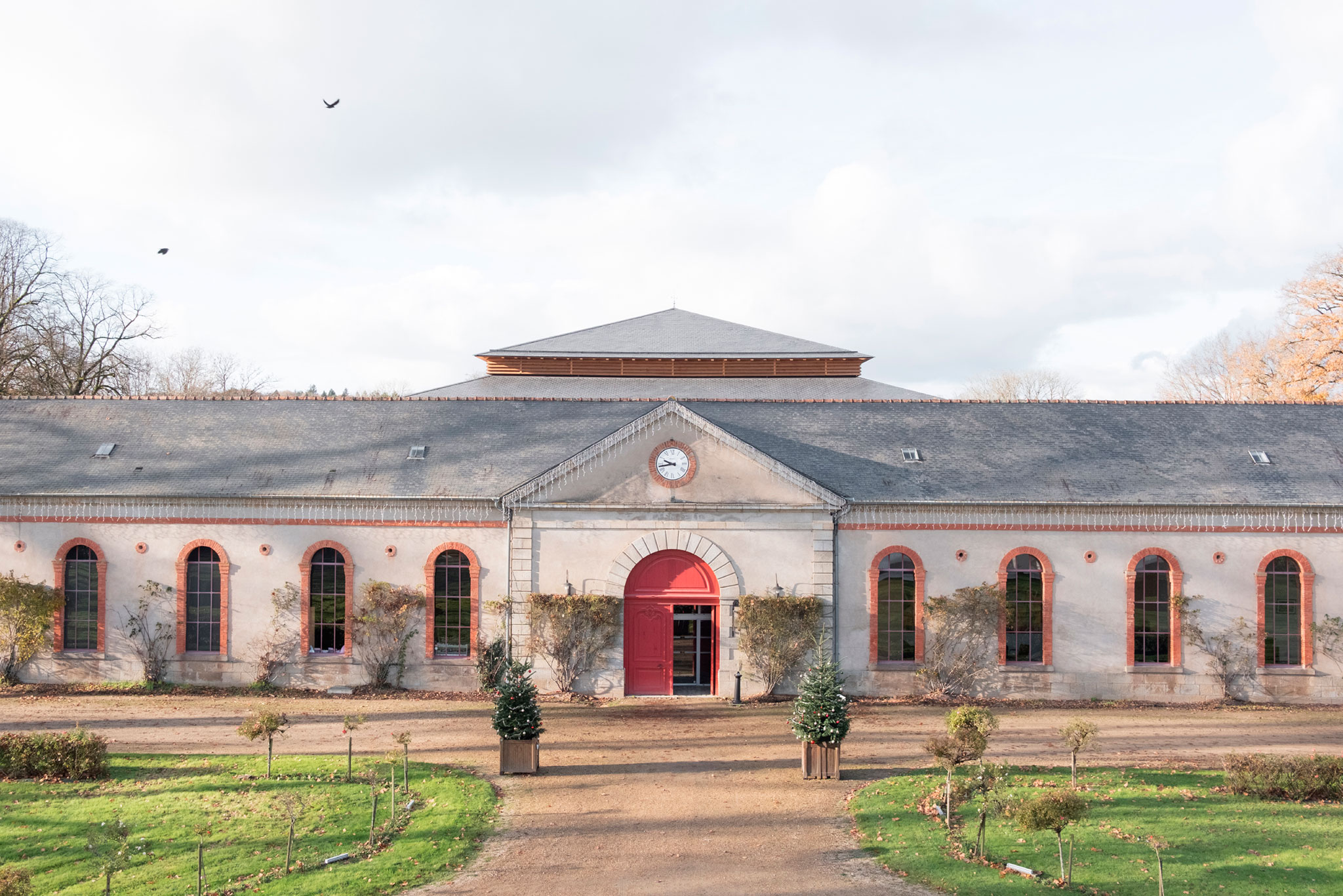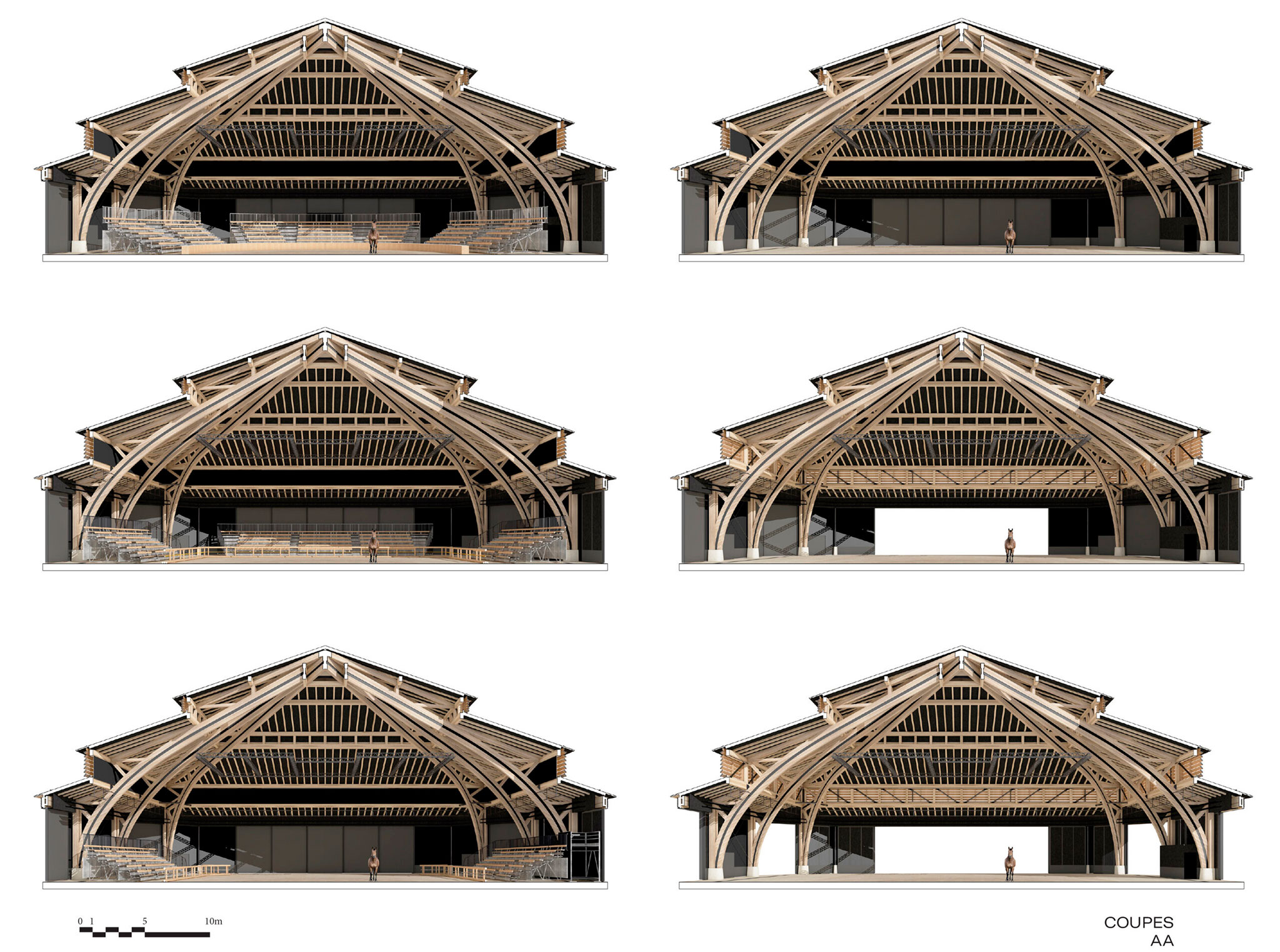 La nueva sala de espectáculos ecuestres, proyectada por K architectures, tiene una altura de diecisiete metros que redefine el perfil del lugar, al elevarse por encima de los establos napoleónicos, dialogando con los tejados históricos de pizarra existentes, recurriendo, según los arquitectos, «a un lenguaje vernáculo clásico para que resuene con el alma del lugar».