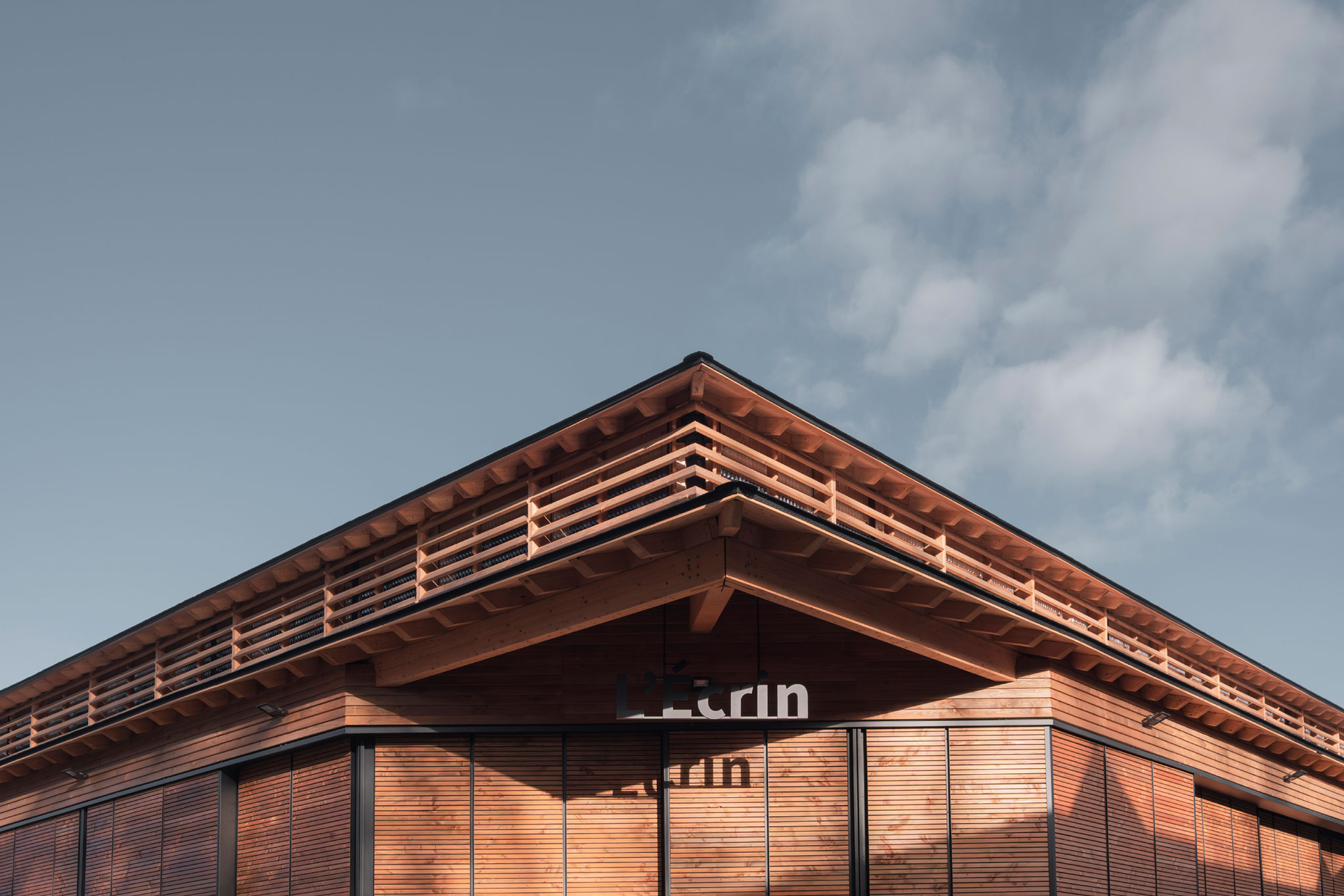 La Grande Halle se concibió bajo la influencia de las formas nobles de los siglos XVII al XIX, pero también bajo el rigor de la conciencia medioambiental actual. Sus materiales constitutivos son esencialmente de origen biológico (madera) y geológico (pizarra). A la vez macizo y etéreo, el lenguaje arquitectónico expresa la necesidad vital de construir estructuras sencillas y robustas. Este proyecto se define como una arquitectura consciente, necesariamente funcional y delicadamente compuesta a través de un enfoque estético arraigado en el patrimonio.