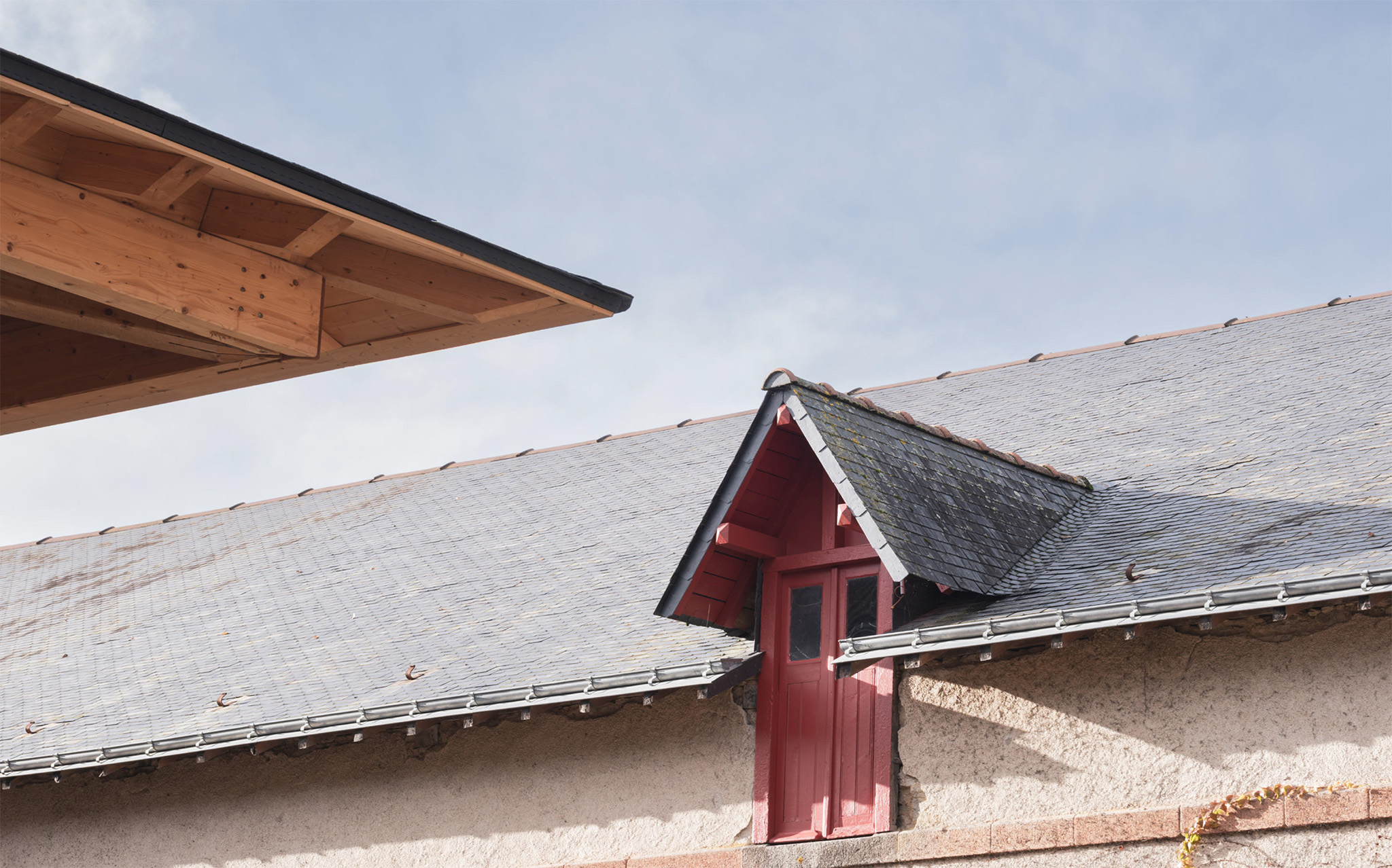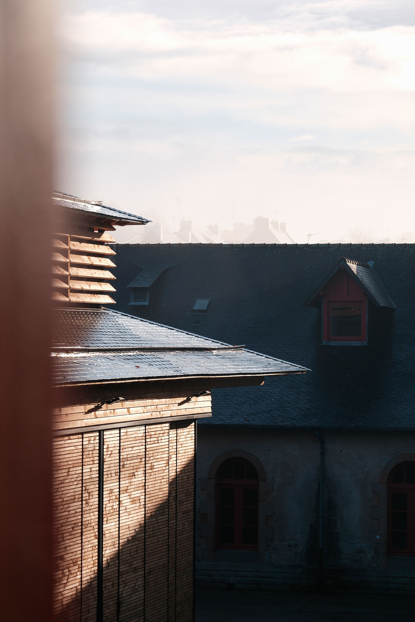La piel del edificio entabla un diálogo temporal a través de una materialidad delicadamente matizada. Las superficies del tejado están revestidas de pizarra rectangular —vestigios de la arquitectura napoleónica— intercaladas con pizarra redondeada de diseño más contemporáneo. El moldeado de las pendientes se convierte en una reinterpretación arquitectónica del léxico gráfico circasiano. A través de este juego de triangulaciones, el tejado se despoja de su rigidez para evocar una sensación de fantasía.