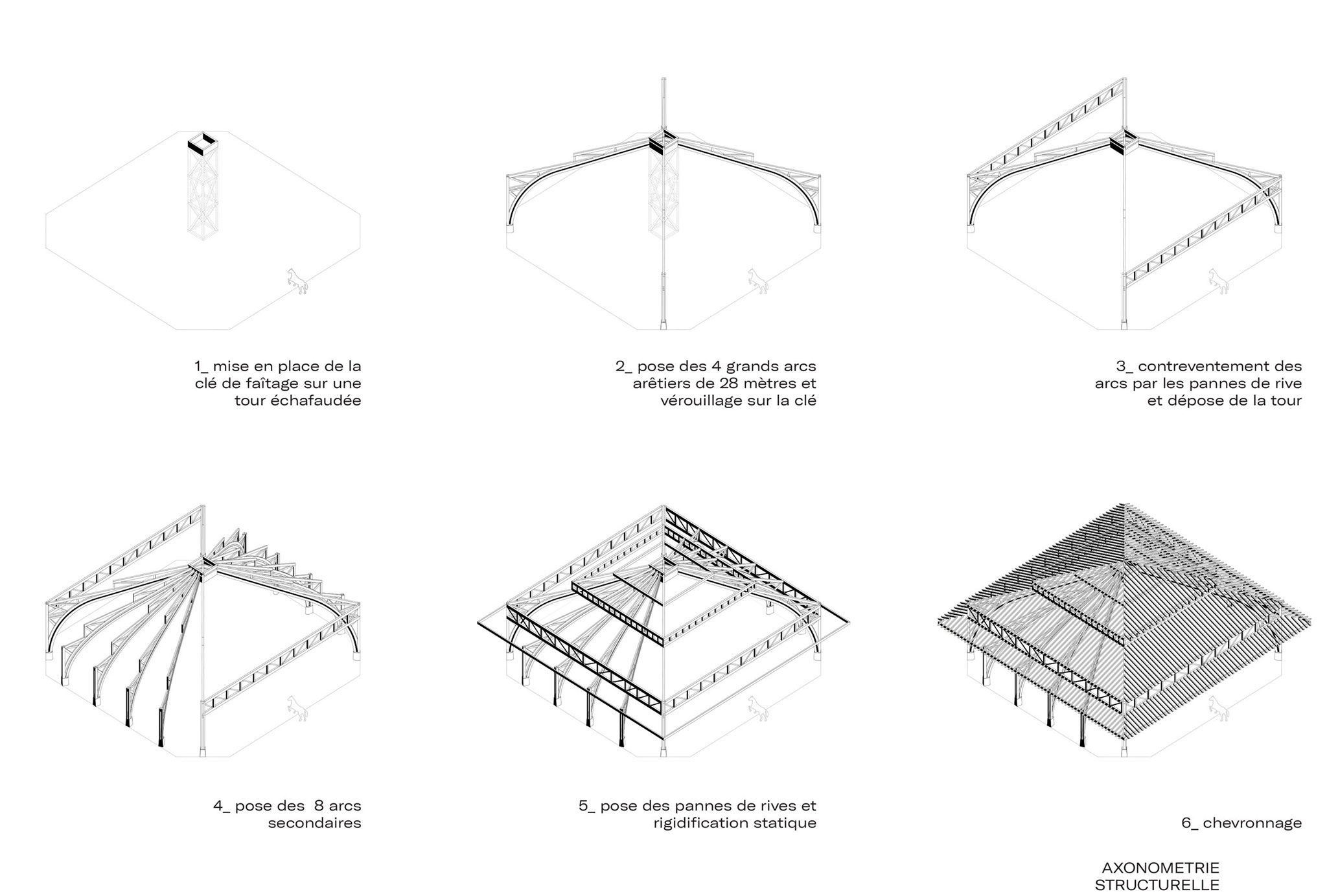La estrategia estructural vino dictada por una intención radical: liberar por completo la sala —y dos de sus cuatro fachadas— de cualquier punto de carga. Esta hazaña se basa en un sistema de arcos que dan lugar a una cúpula, sobre la que se encaja una pirámide escalonada. Los arcos se elevan de forma escalonada para sostener vigas en celosía que abarcan las fachadas de un solo trazo. Esta ausencia de apoyos intermedios permite que la arena se abra con total transparencia. Al cruzar la Cour du Puits desde la Écurie d’Honneur, la mirada recorre la sala para ofrecer a los visitantes una vista panorámica y frontal de las caballerizas históricas, integrando el espectáculo ecuestre en su joyero patrimonial.