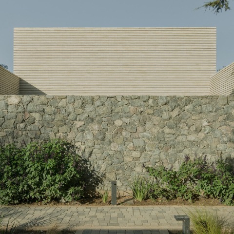 El lenguaje se caracteriza por una dualidad material. Un basamento contínuo de piedra establece una base sólida, pesada que se arraiga al entorno y contrasta con los volúmenes superiores livianos en ladrillo blanco. Esta dicotomía genera un diálogo entre opuestos buscando el equilibrio de la composición.