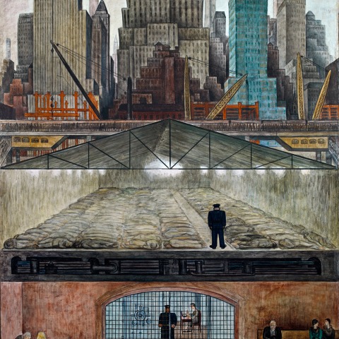 Rivera ya gozaba de prestigio internacional. Era la figura más conocida del muralismo mexicano, movimiento de arte público a gran escala que surgió en los años veinte, al término de la Revolución mexicana. Sin embargo, sus murales —por definición fijos a un solo sitio— resultaban imposibles de transportar para la exposición. Con el propósito de solucionar este problema, el Museo trajo a Rivera a Nueva York seis semanas antes de la inauguración de la muestra y le proporcionó un estudio improvisado en una galería vacía. Ahí, Rivera creó cinco “murales portátiles” —frescos transportables que conmemoraban episodios de la historia de México— los cuales ocuparon un lugar de relevancia en la retrospectiva. Después de la inauguración, celebrada entre enorme revuelo publicitario, Rivera realizó tres murales más inspirados en temas del Nueva York contemporáneo que expresó a través de imágenes monumentales de la ciudad durante la Gran Depresión. La historia de esta comisión extraordinaria revela el papel fundamental de Rivera en los debates acerca de la influencia social y política del arte público durante un periodo de crisis económica.