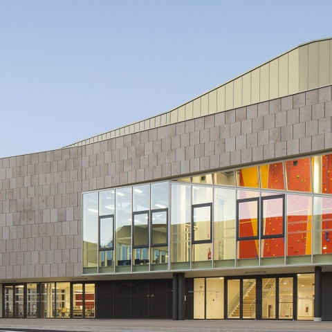 Un grupo de equipos, un salón de eventos omnisport con gradas, un gimnasio doble, salón de baile, escalada piscinas cubiertas y al aire libre de pared diseñadas por TNA Architectes y en asociación con el Grupo Vinci.